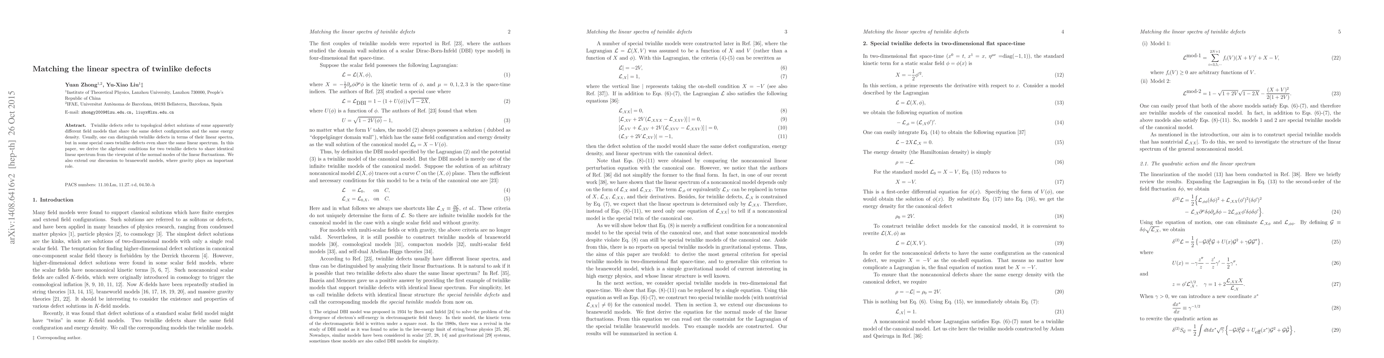 This paper derives algebraic conditions for twinlike defects, which are topological solutions sharing the same defect configuration and energy density, to have identical linear spectra based on their normal modes. It also extends the analysis to braneworld models where gravity significantly influences the defect behavior.