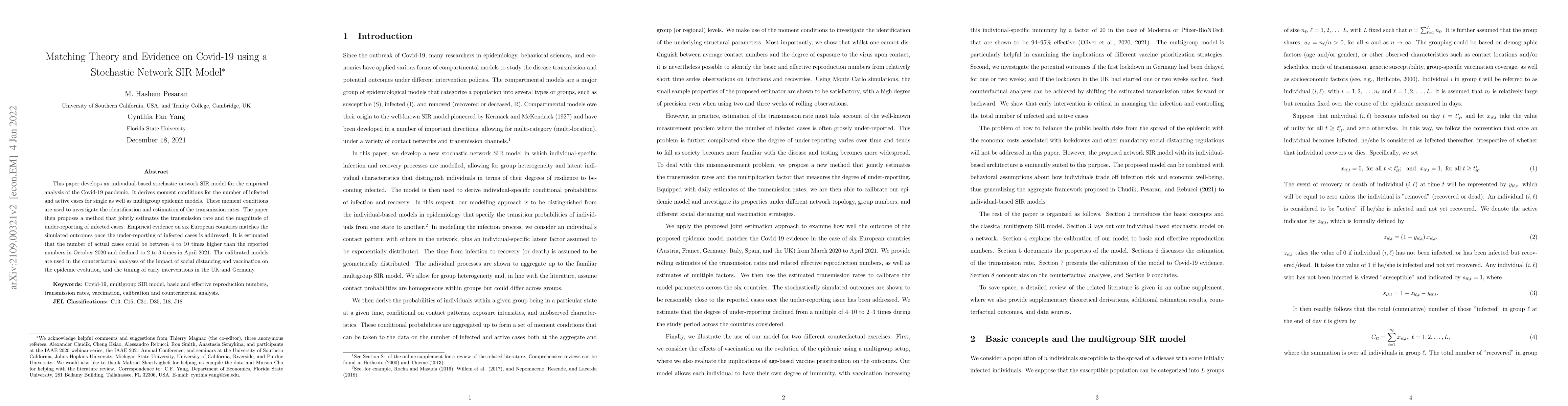 This paper develops an individual-based stochastic network SIR model for the empirical analysis of the Covid-19 pandemic. It derives moment conditions for the number of infected and active cases for single as well as multigroup epidemic models. These moment conditions are used to investigate the identification and estimation of the transmission rates. The paper then proposes a method that jointly estimates the transmission rate and the magnitude of under-reporting of infected cases. Empirical evidence on six European countries matches the simulated outcomes once the under-reporting of infected cases is addressed. It is estimated that the number of actual cases could be between 4 to 10 times higher than the reported numbers in October 2020 and declined to 2 to 3 times in April 2021. The calibrated models are used in the counterfactual analyses of the impact of social distancing and vaccination on the epidemic evolution, and the timing of early interventions in the UK and Germany.