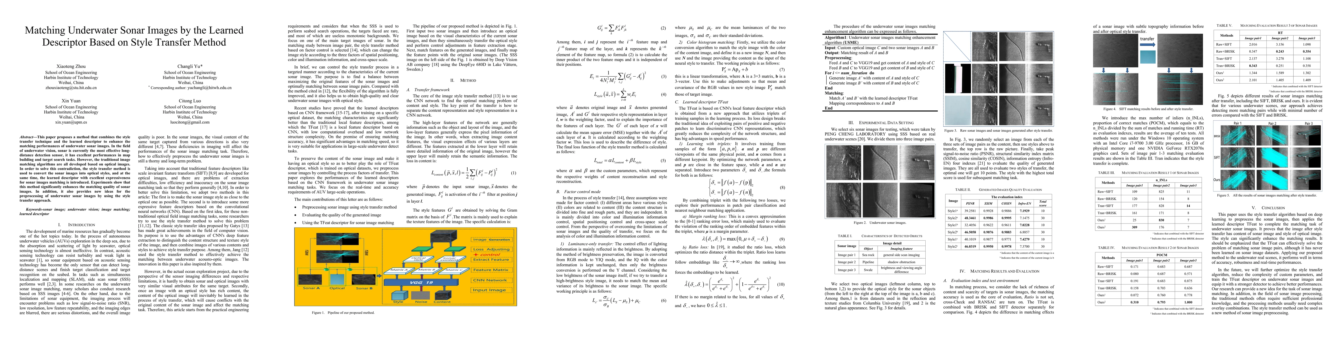 This paper introduces a method combining style transfer and learned descriptors to improve underwater sonar image matching. By converting sonar images to optical styles and using expressive descriptors, the method significantly enhances sonar image matching quality, offering new preprocessing ideas for underwater sonar images.