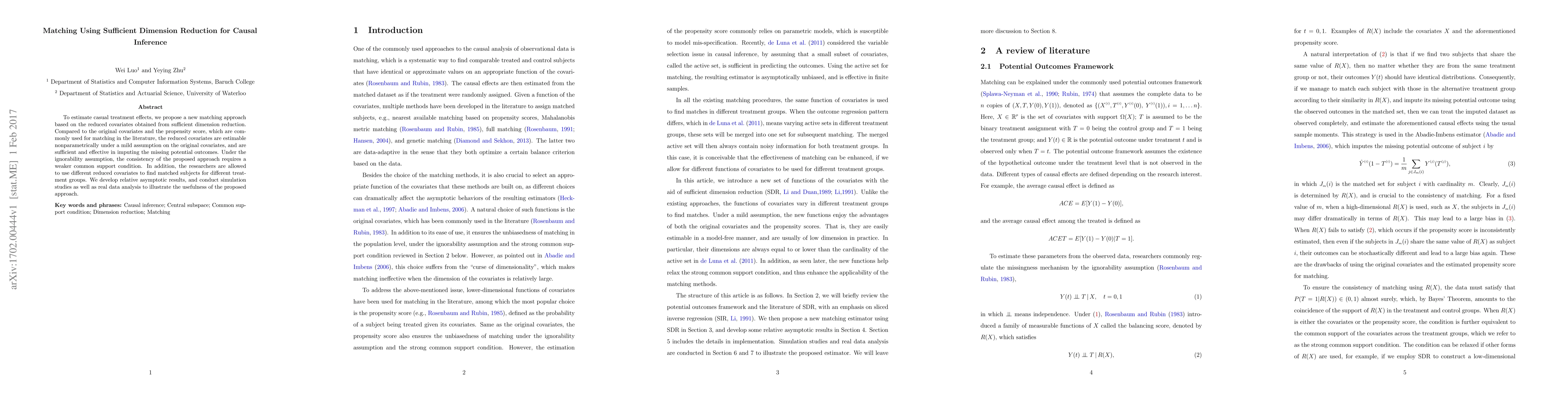 This paper proposes a novel matching method for causal inference using sufficient dimension reduction to identify reduced covariates, which are more effective than traditional methods. The approach requires a weaker common support condition and allows for different reduced covariates for different treatment groups, demonstrated through simulations and real data analysis.