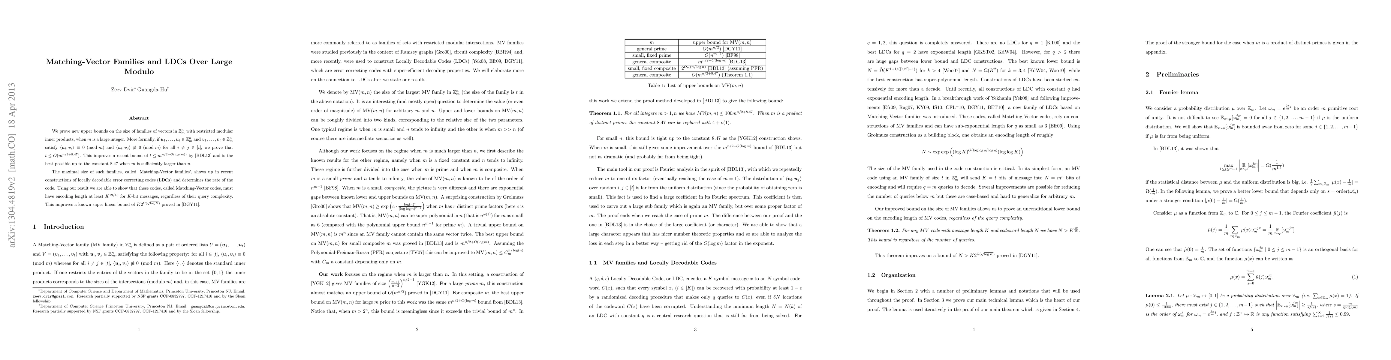 We prove new upper bounds on the size of families of vectors in $\Z_m^n$ with restricted modular inner products, when $m$ is a large integer. More formally, if $\vec{u}_1,\ldots,\vec{u}_t \in \Z_m^n$ and $\vec{v}_1,\ldots,\vec{v}_t \in \Z_m^n$ satisfy $\langle\vec{u}_i,\vec{v}_i\rangle\equiv0\pmod m$ and $\langle\vec{u}_i,\vec{v}_j\rangle\not\equiv0\pmod m$ for all $i\neq j\in[t]$, we prove that $t \leq O(m^{n/2+8.47})$. This improves a recent bound of $t \leq m^{n/2 + O(\log(m))}$ by \cite{BDL13} and is the best possible up to the constant 8.47 when $m$ is sufficiently larger than $n$. The maximal size of such families, called `Matching-Vector families', shows up in recent constructions of locally decodable error correcting codes (LDCs) and determines the rate of the code. Using our result we are able to show that these codes, called Matching-Vector codes, must have encoding length at least $K^{19/18}$ for $K$-bit messages, regardless of their query complexity. This improves a known super linear bound of $ K2^{\Omega({\sqrt{\log K}})}$ proved in \cite{DGY11}.