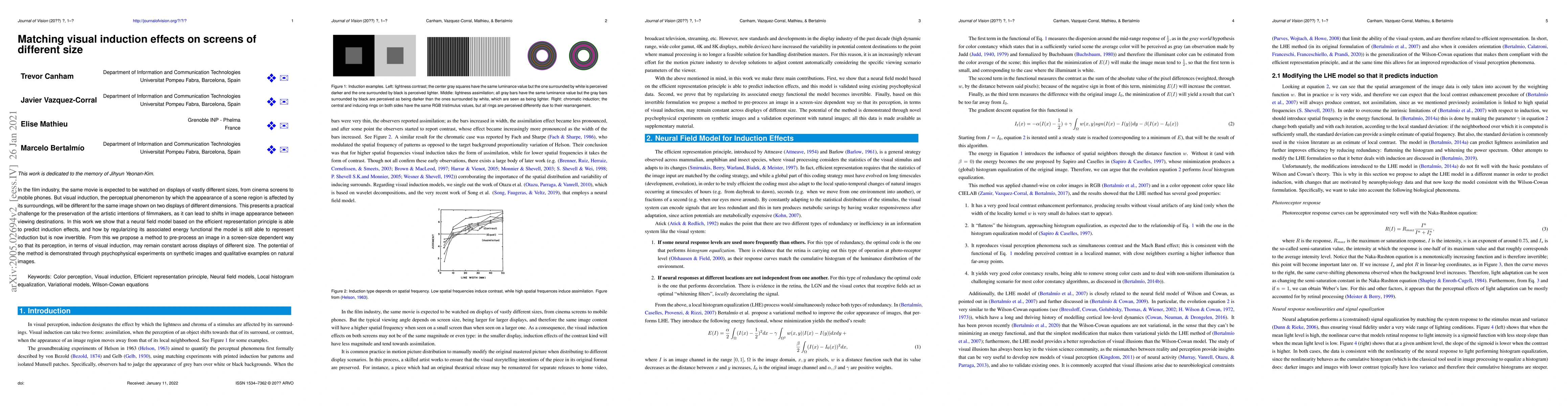 In the film industry, the same movie is expected to be watched on displays of vastly different sizes, from cinema screens to mobile phones. But visual induction, the perceptual phenomenon by which the appearance of a scene region is affected by its surroundings, will be different for the same image shown on two displays of different dimensions. This presents a practical challenge for the preservation of the artistic intentions of filmmakers, as it can lead to shifts in image appearance between viewing destinations. In this work we show that a neural field model based on the efficient representation principle is able to predict induction effects, and how by regularizing its associated energy functional the model is still able to represent induction but is now invertible. From this we propose a method to pre-process an image in a screen-size dependent way so that its perception, in terms of visual induction, may remain constant across displays of different size. The potential of the method is demonstrated through psychophysical experiments on synthetic images and qualitative examples on natural images.