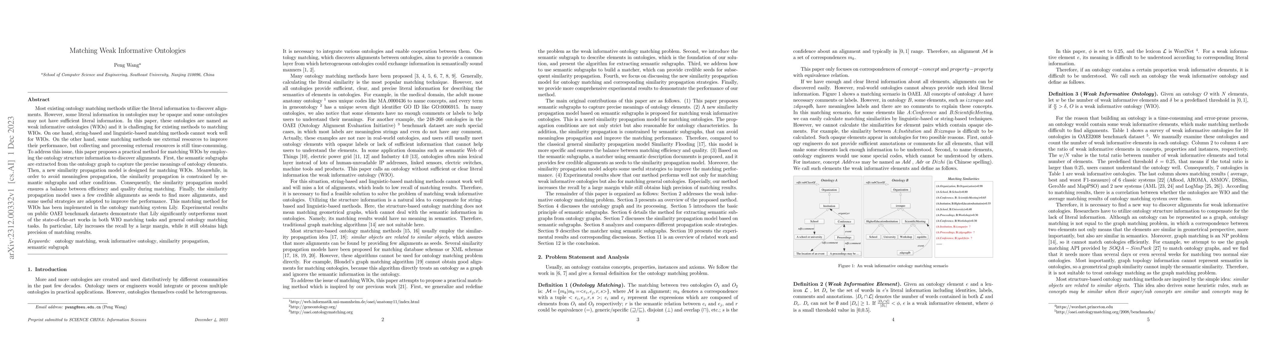 This paper proposes a method for matching weak informative ontologies (WIOs) by leveraging ontology structure information rather than literal data. It introduces a similarity propagation model constrained by semantic subgraphs to balance efficiency and quality, significantly outperforming state-of-the-art methods in experimental evaluations on public datasets.