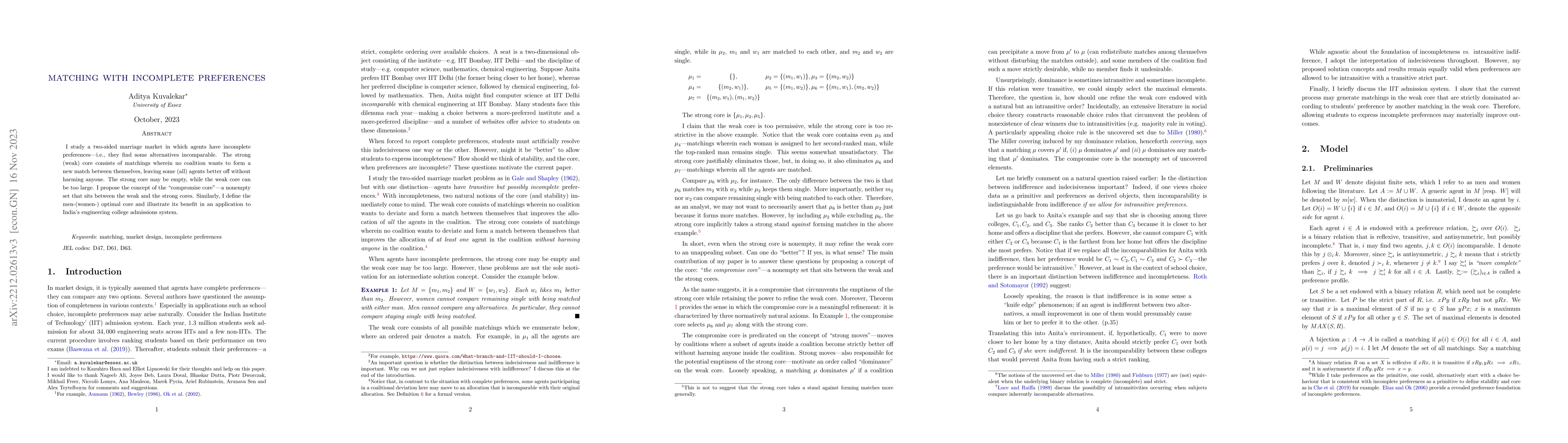 This paper explores a two-sided marriage market with incomplete preferences, proposing the "compromise core" between the strong and weak cores. It also introduces men-optimal and women-optimal cores, demonstrating their utility through an application to India's engineering college admissions system.