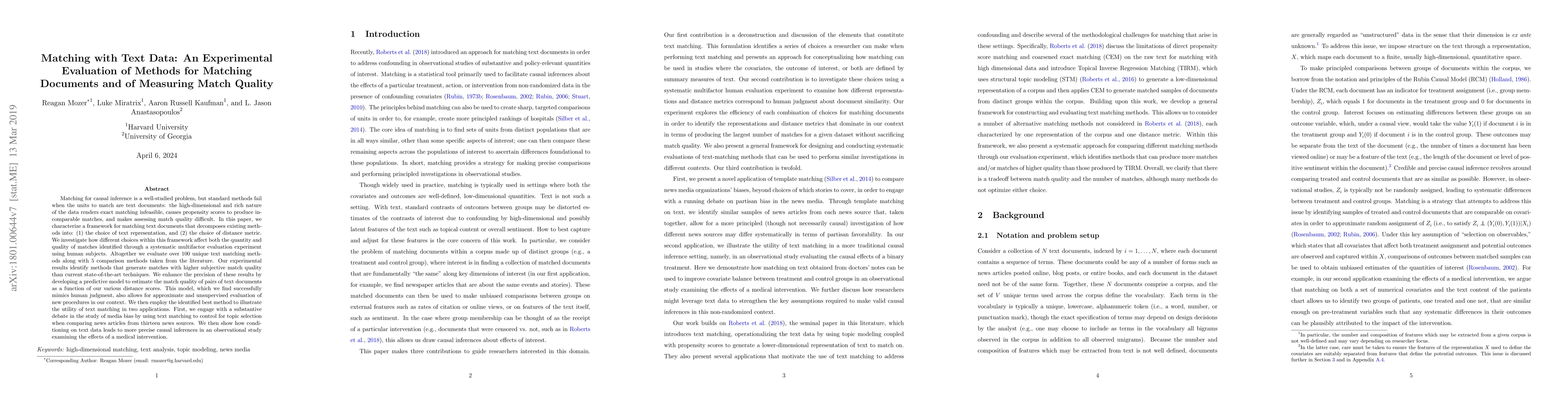 Matching for causal inference is a well-studied problem, but standard methods fail when the units to match are text documents: the high-dimensional and rich nature of the data renders exact matching infeasible, causes propensity scores to produce incomparable matches, and makes assessing match quality difficult. In this paper, we characterize a framework for matching text documents that decomposes existing methods into: (1) the choice of text representation, and (2) the choice of distance metric. We investigate how different choices within this framework affect both the quantity and quality of matches identified through a systematic multifactor evaluation experiment using human subjects. Altogether we evaluate over 100 unique text matching methods along with 5 comparison methods taken from the literature. Our experimental results identify methods that generate matches with higher subjective match quality than current state-of-the-art techniques. We enhance the precision of these results by developing a predictive model to estimate the match quality of pairs of text documents as a function of our various distance scores. This model, which we find successfully mimics human judgment, also allows for approximate and unsupervised evaluation of new procedures. We then employ the identified best method to illustrate the utility of text matching in two applications. First, we engage with a substantive debate in the study of media bias by using text matching to control for topic selection when comparing news articles from thirteen news sources. We then show how conditioning on text data leads to more precise causal inferences in an observational study examining the effects of a medical intervention.