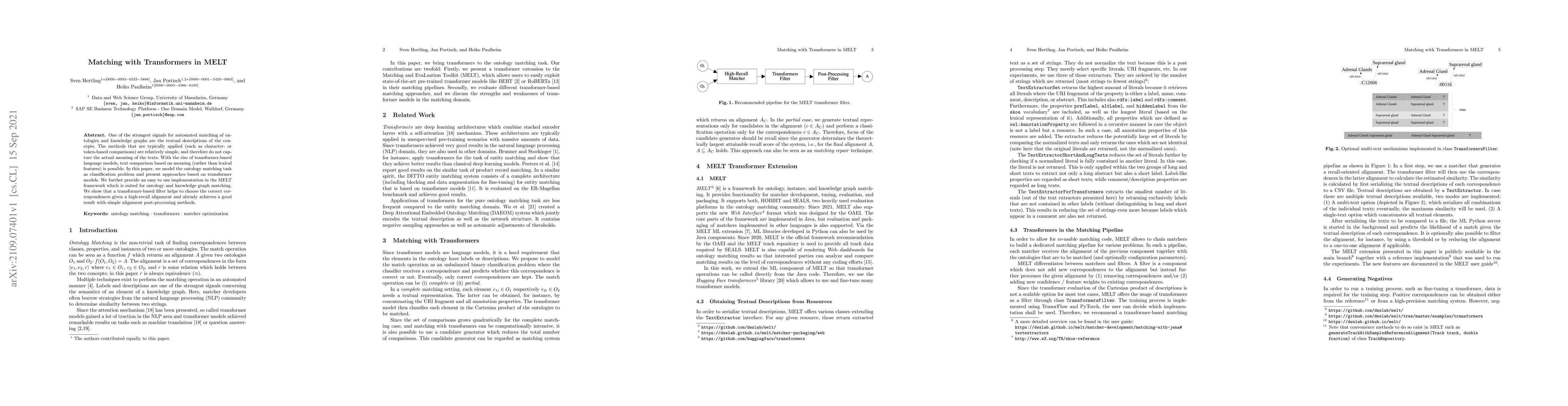 This paper proposes transformer-based approaches for ontology matching, framing it as a classification problem. It demonstrates that using transformer models for semantic text comparison outperforms traditional methods, and provides an implementation in the MELT framework for effective ontology and knowledge graph alignment.