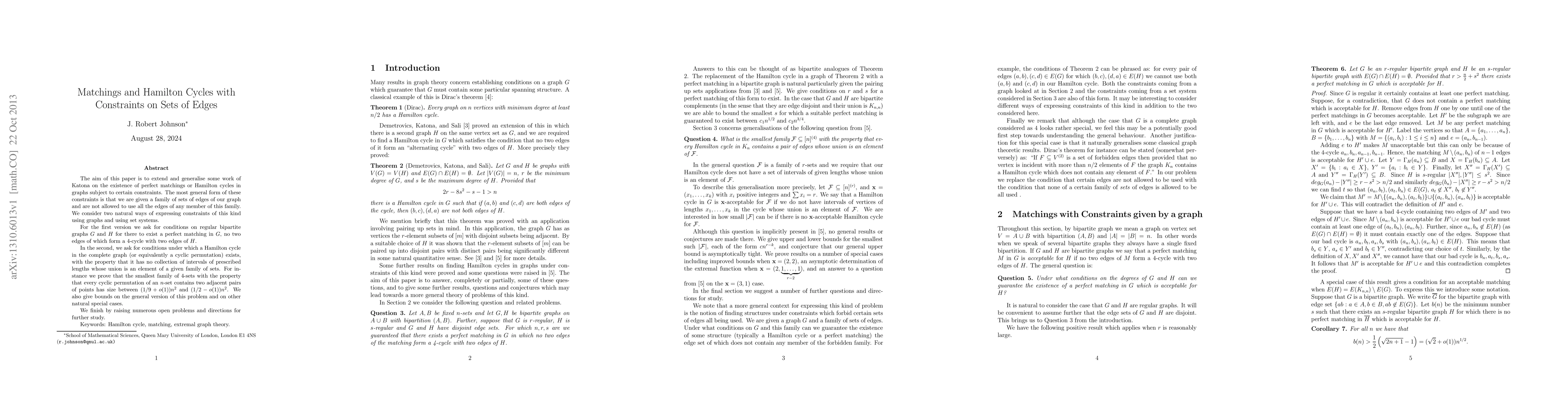 The aim of this paper is to extend and generalise some work of Katona on the existence of perfect matchings or Hamilton cycles in graphs subject to certain constraints. The most general form of these constraints is that we are given a family of sets of edges of our graph and are not allowed to use all the edges of any member of this family. We consider two natural ways of expressing constraints of this kind using graphs and using set systems. For the first version we ask for conditions on regular bipartite graphs $G$ and $H$ for there to exist a perfect matching in $G$, no two edges of which form a $4$-cycle with two edges of $H$. In the second, we ask for conditions under which a Hamilton cycle in the complete graph (or equivalently a cyclic permutation) exists, with the property that it has no collection of intervals of prescribed lengths whose union is an element of a given family of sets. For instance we prove that the smallest family of $4$-sets with the property that every cyclic permutation of an $n$-set contains two adjacent pairs of points has size between $(1/9+o(1))n^2$ and $(1/2-o(1))n^2$. We also give bounds on the general version of this problem and on other natural special cases. We finish by raising numerous open problems and directions for further study.