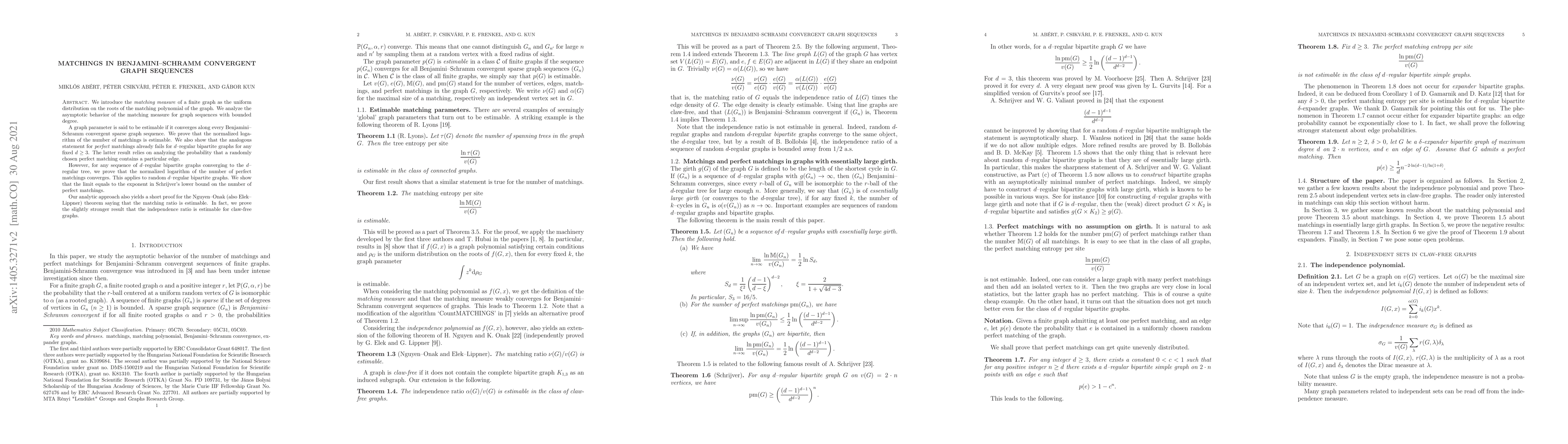This paper investigates the asymptotic behavior of matching measures in Benjamini-Schramm convergent graph sequences, proving that the normalized logarithm of the number of matchings is estimable. It contrasts this with the non-estimability of the number of perfect matchings in d-regular bipartite graphs, except for sequences converging to the d-regular tree.