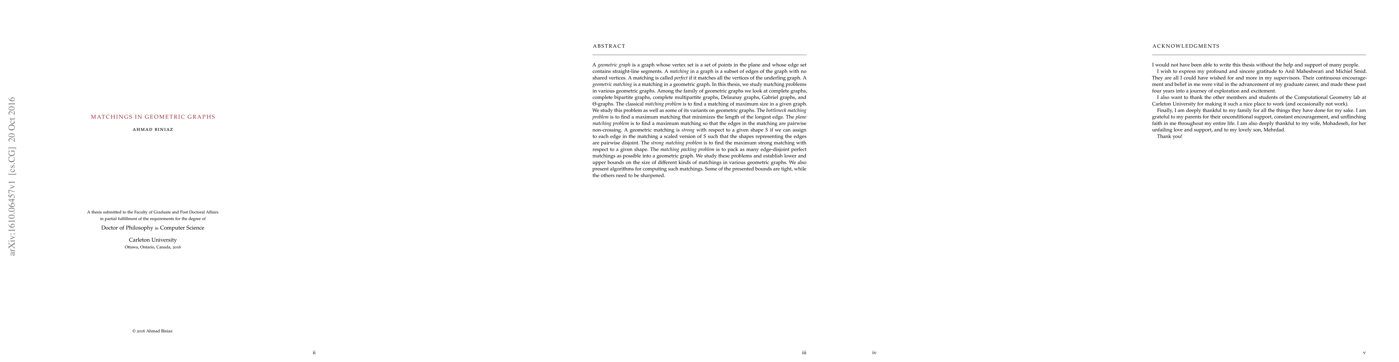 This paper explores various matching problems in different types of geometric graphs, including complete, bipartite, and multipartite graphs, as well as Delaunay, Gabriel, and $\Theta$-graphs. It investigates classical, bottleneck, plane, strong, and matching packing problems, establishing bounds and presenting algorithms for computing matchings.