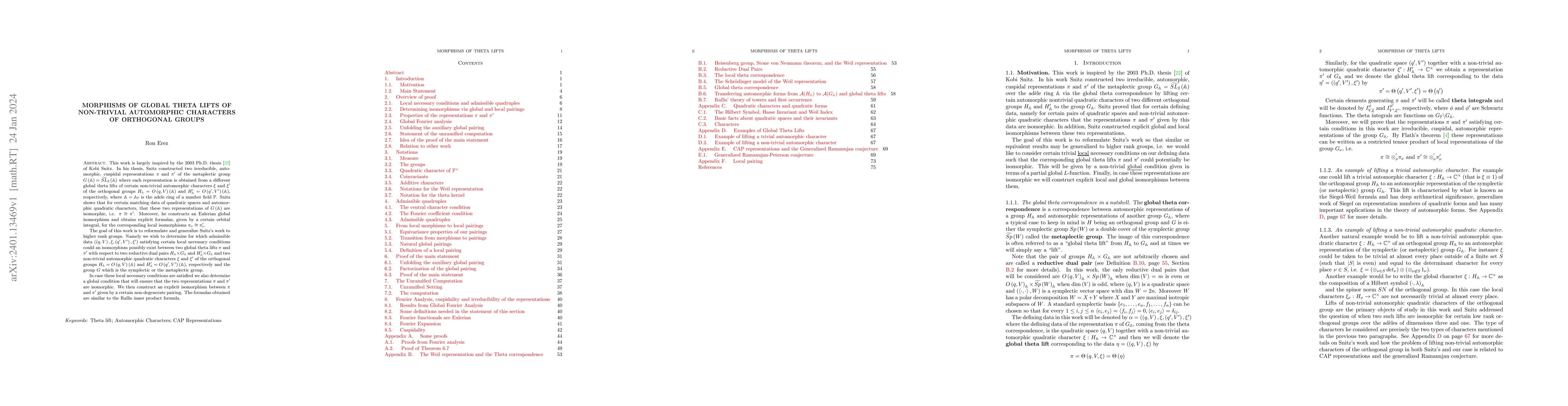 This work is largely inspired by the 2003 Ph.D. thesis \cite{snitz} of Kobi Snitz. In his thesis, Snitz constructed two irreducible, automorphic, cuspidal representations $ \pi $ and $ \pi' $ of the metaplectic group $ G\left ( \mathbb A \right ) = \widetilde{ SL }_{ 2 } \left ( \mathbb A \right ) $ where each representation is obtained from a different global theta lifts of certain non-trivial automorphic characters $ \xi $ and $ \xi' $ of the orthogonal groups $ H_{ \mathbb A } = O \left ( q, V \right ) \left ( \mathbb A \right ) $ and $ H_{ \mathbb A } '= O \left ( q', V' \right ) \left ( \mathbb A \right ) $, respectively, where $ \mathbb A = \mathbb A_{ \mathbb F } $ is the adele ring of a number field $ \mathbb F $. Snitz shows that for certain matching data of quadratic spaces and automorphic quadratic characters, that these two representations of $ G \left ( \mathbb A \right ) $ are isomorphic, i.e. $ \pi\cong\pi'$. The goal of this work is to reformulate and generalize Snitz's work to higher rank groups. Namely we wish to determine for which admissible data $\left ( \left ( q, V \right ) ,\xi , \left ( q', V' \right ),\xi'\right )$ satisfying certain local necessary conditions could an isomorphism possibly exist between two global theta lifts $ \pi $ and $ \pi'$ with respect to two reductive dual pairs $ H_{ \mathbb A } \times G_{ \mathbb A } $ and $ H'_{ \mathbb A } \times G_{ \mathbb A } $ and two non-trivial automorphic quadratic characters $ \xi $ and $ \xi'$ of the orthogonal groups $ H_{ \mathbb A } = O \left ( q, V \right ) \left ( \mathbb A \right ) $ and $ H_{ \mathbb A } '= O \left ( q', V'\right ) \left ( \mathbb A \right ) $, respectively and the group $ G $ which is the symplectic or the metaplectic group.