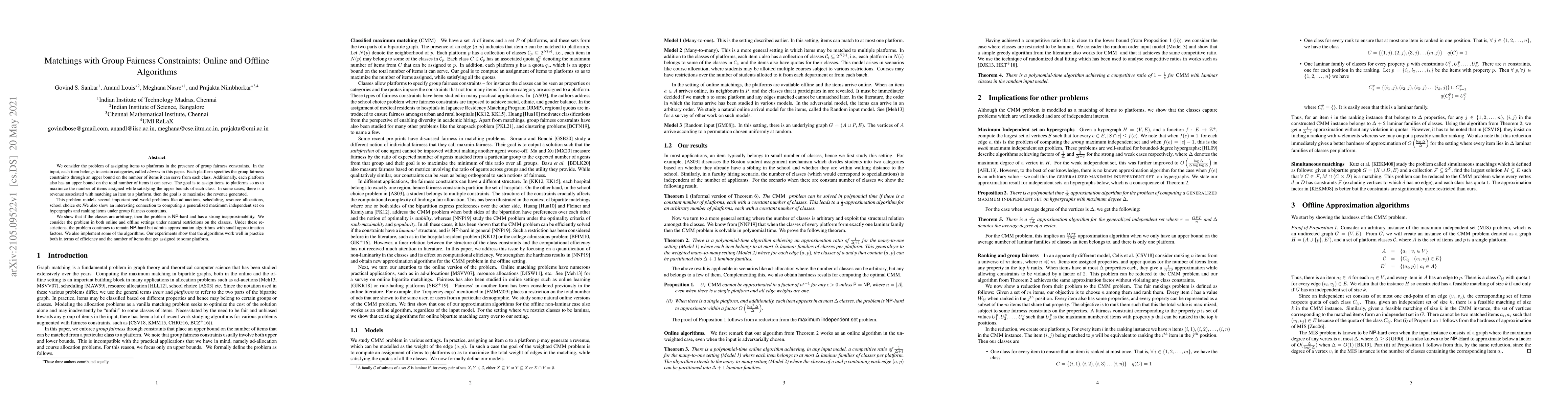 We consider the problem of assigning items to platforms in the presence of group fairness constraints. In the input, each item belongs to certain categories, called classes in this paper. Each platform specifies the group fairness constraints through an upper bound on the number of items it can serve from each class. Additionally, each platform also has an upper bound on the total number of items it can serve. The goal is to assign items to platforms so as to maximize the number of items assigned while satisfying the upper bounds of each class. In some cases, there is a revenue associated with matching an item to a platform, then the goal is to maximize the revenue generated. This problem models several important real-world problems like ad-auctions, scheduling, resource allocations, school choice etc.We also show an interesting connection to computing a generalized maximum independent set on hypergraphs and ranking items under group fairness constraints. We show that if the classes are arbitrary, then the problem is NP-hard and has a strong inapproximability. We consider the problem in both online and offline settings under natural restrictions on the classes. Under these restrictions, the problem continues to remain NP-hard but admits approximation algorithms with small approximation factors. We also implement some of the algorithms. Our experiments show that the algorithms work well in practice both in terms of efficiency and the number of items that get assigned to some platform.