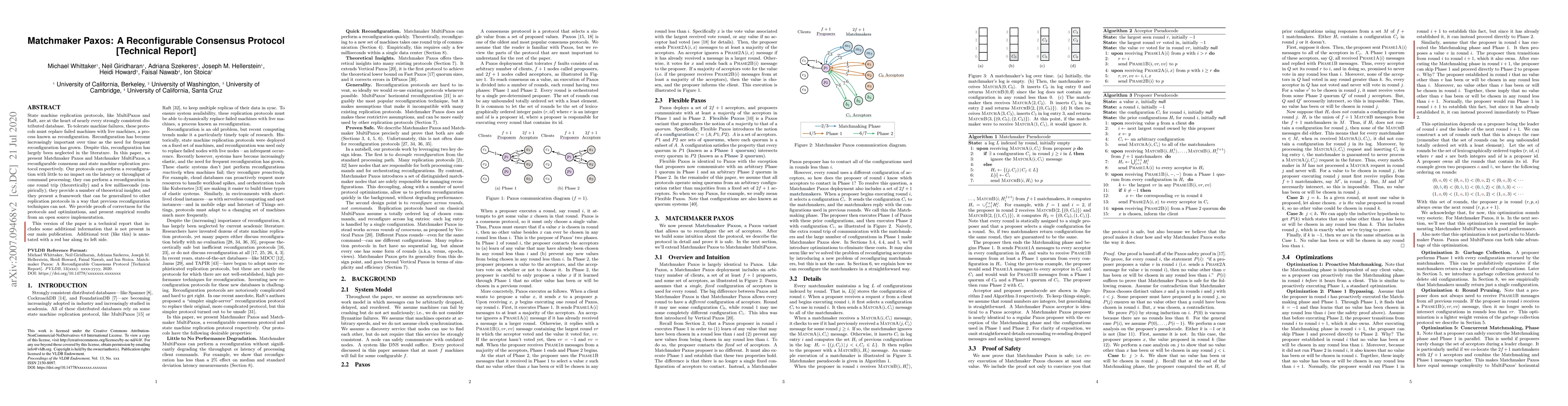 Matchmaker Paxos introduces a reconfigurable consensus protocol that enables efficient machine replacement in distributed databases with minimal latency impact. The protocol offers theoretical insights and empirical performance, allowing for swift reconfiguration with negligible throughput degradation.