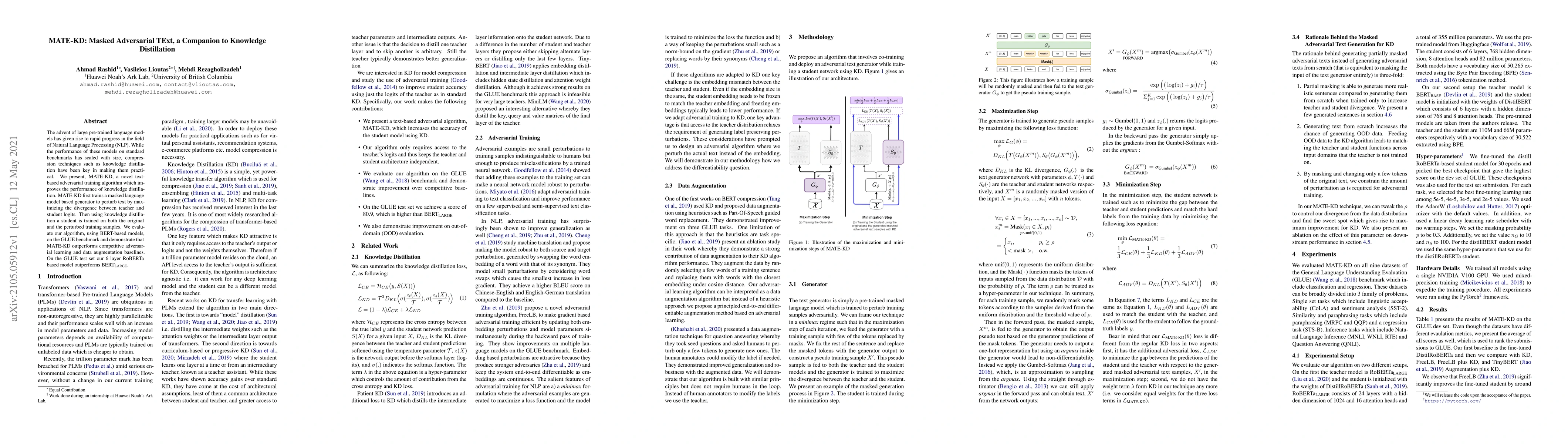 MATE-KD is a novel adversarial training method that enhances knowledge distillation in NLP, using a masked language model to perturb text and improve student model performance. Evaluated on GLUE, it outperforms competitive baselines, with a 6-layer RoBERTa model achieving better results than BERT-Large.