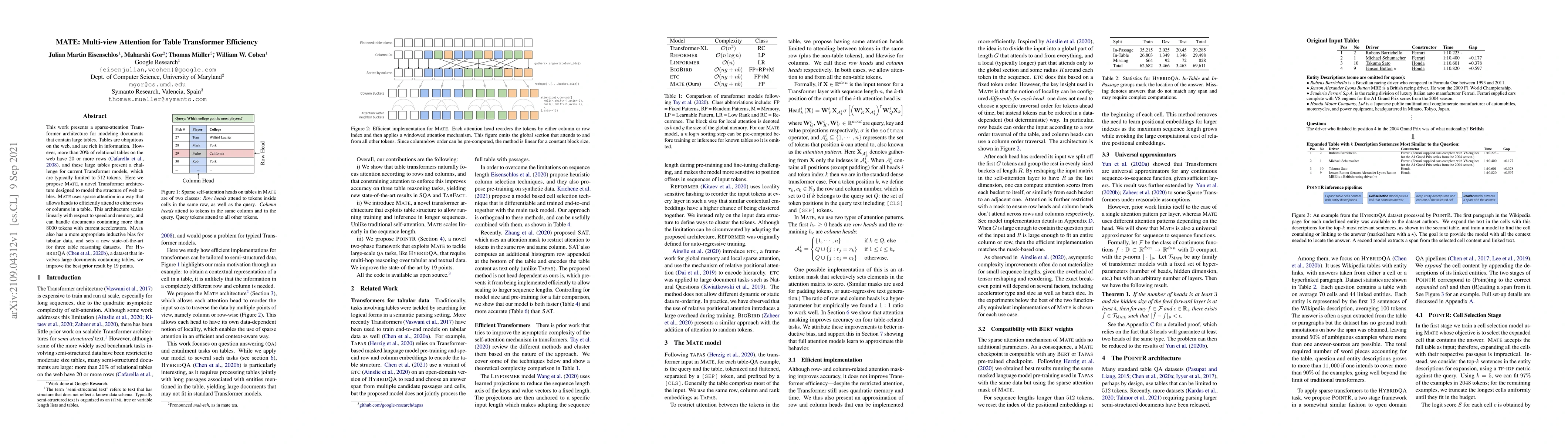 The MATE Transformer architecture is a new, efficient model for processing large tables in documents, outperforming prior models on table reasoning tasks. It achieves state-of-the-art results with linear scalability and can handle documents containing over 8000 tokens.