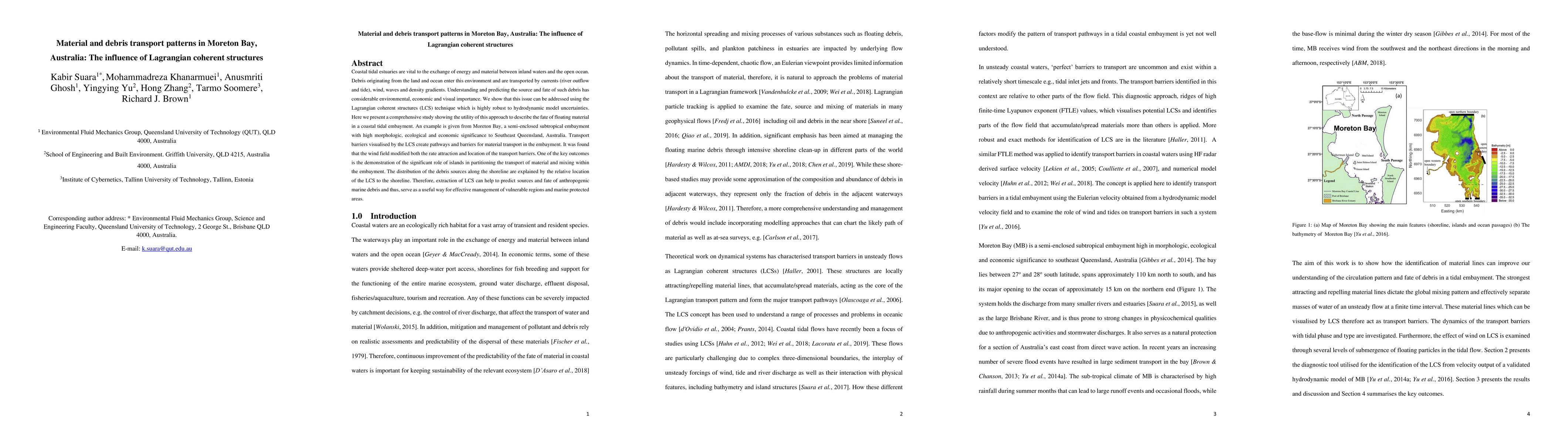 This study employs Lagrangian coherent structures (LCS) to analyze material and debris transport patterns in Moreton Bay, Australia, highlighting their role in partitioning material transport and mixing. The LCS technique reveals how wind and islands influence transport barriers, aiding in the prediction of debris sources and fate, which is crucial for effective management of marine protected areas.