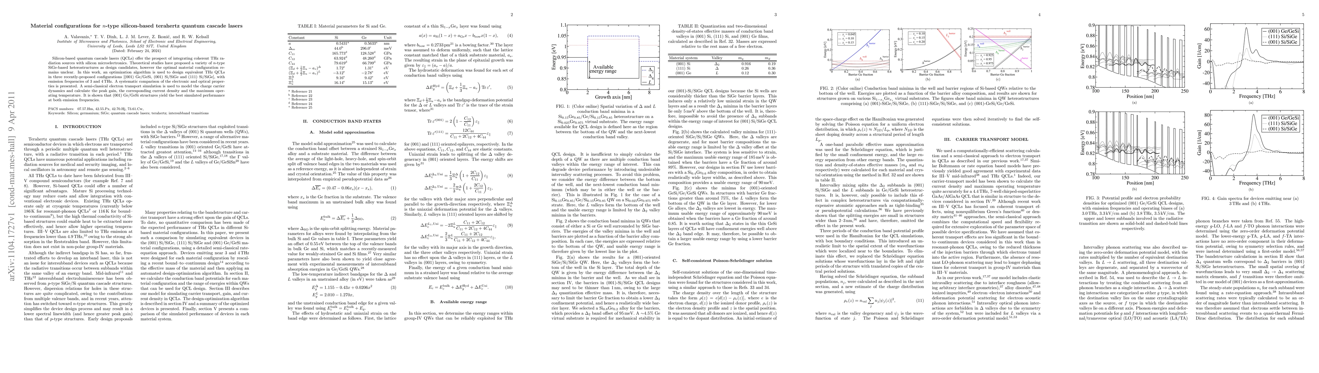This paper optimizes three n-type silicon-based quantum cascade laser configurations for terahertz emission, finding that (001) Ge/GeSi structures provide the best performance in terms of peak gain, current density, and maximum operating temperature. The study uses a systematic comparison and semi-classical electron transport simulation to evaluate the electronic and optical properties of the proposed heterostructures.