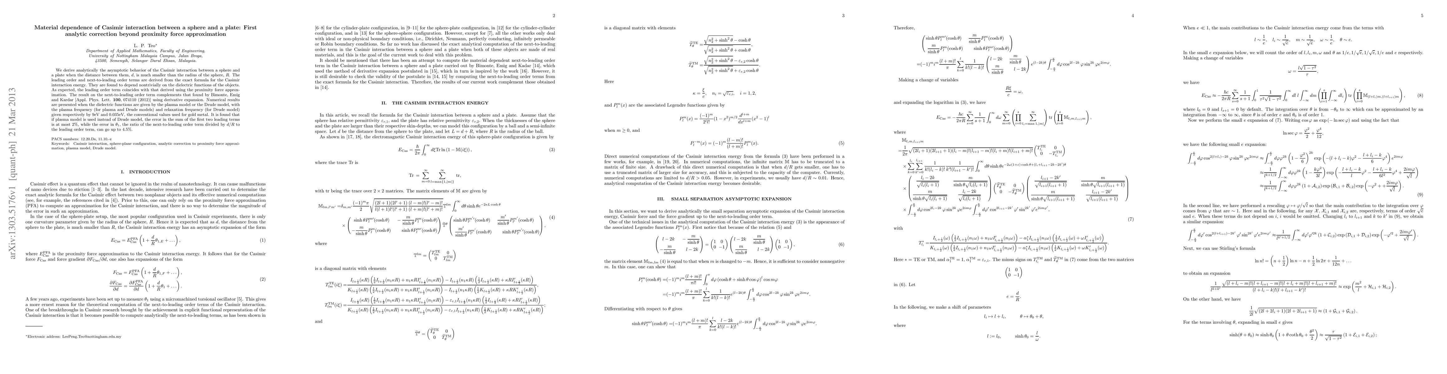 This paper analytically derives the leading and next-to-leading order terms for the Casimir interaction between a sphere and a plate, showing that these terms depend on the dielectric functions of the materials. The results complement previous findings using a derivative expansion and are numerically validated for gold using plasma and Drude models.