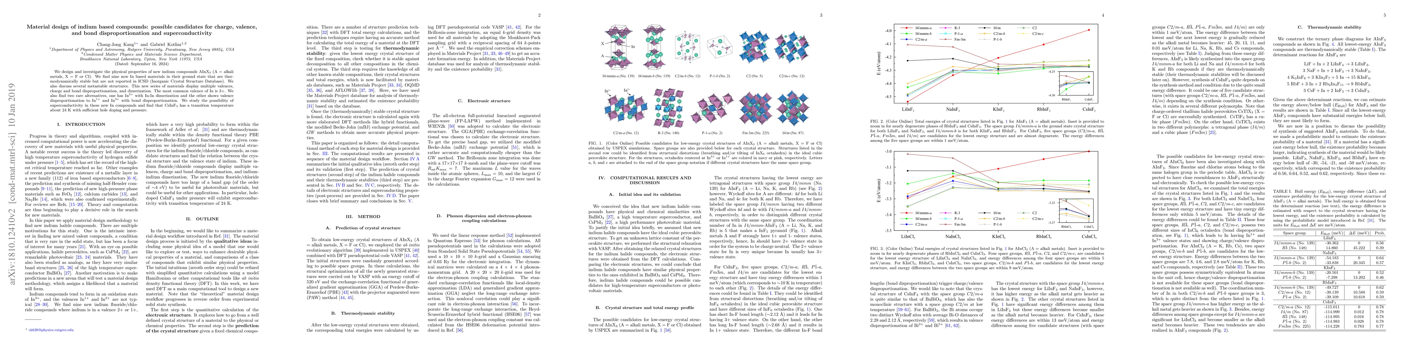 This paper designs new indium-based compounds AInX$_3$ (A = alkali metals, X = F or Cl), identifying nine stable materials not previously reported. These compounds exhibit unique properties like multiple valences, charge disproportionation, and superconductivity potential, with CsInF$_3$ showing superconductivity at 24 K under specific conditions.
