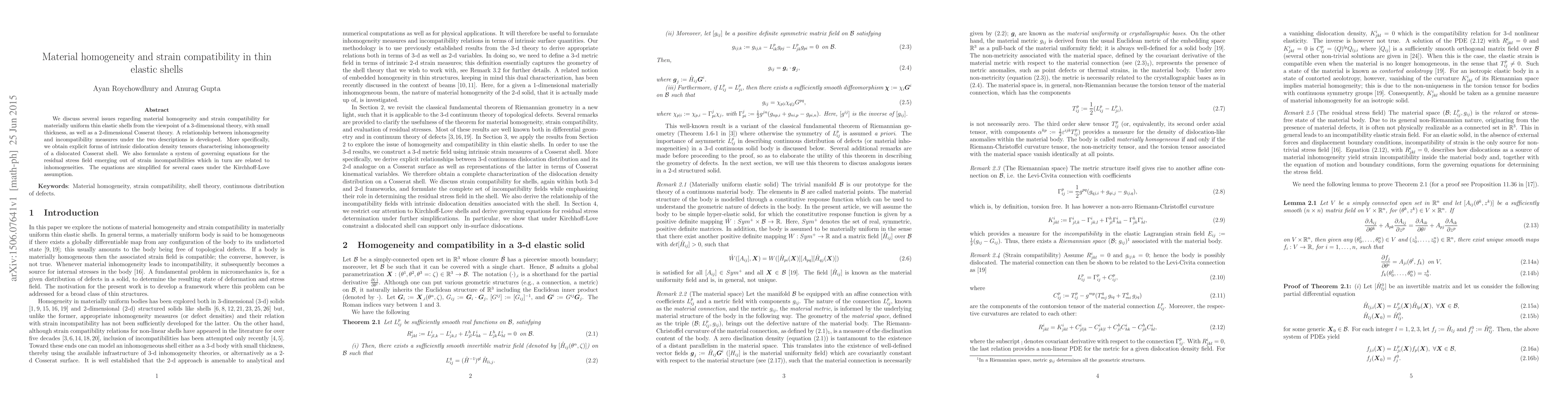 This paper explores material homogeneity and strain compatibility in thin elastic shells, comparing 3-dimensional and 2-dimensional Cosserat theories. It develops intrinsic dislocation density tensors and formulates governing equations for residual stress fields due to strain incompatibilities, simplified under Kirchhoff-Love assumptions.