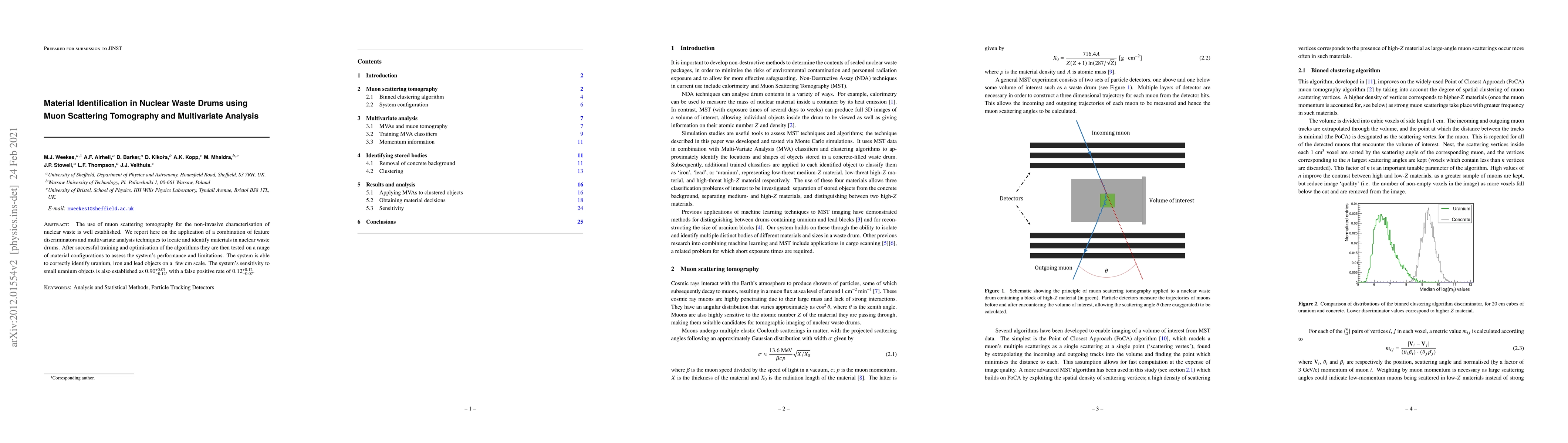 This paper presents a method using muon scattering tomography combined with multivariate analysis to non-invasively identify materials in nuclear waste drums, successfully distinguishing uranium, iron, and lead on a few cm scale, with a sensitivity of 0.90 and a false positive rate of 0.12.
