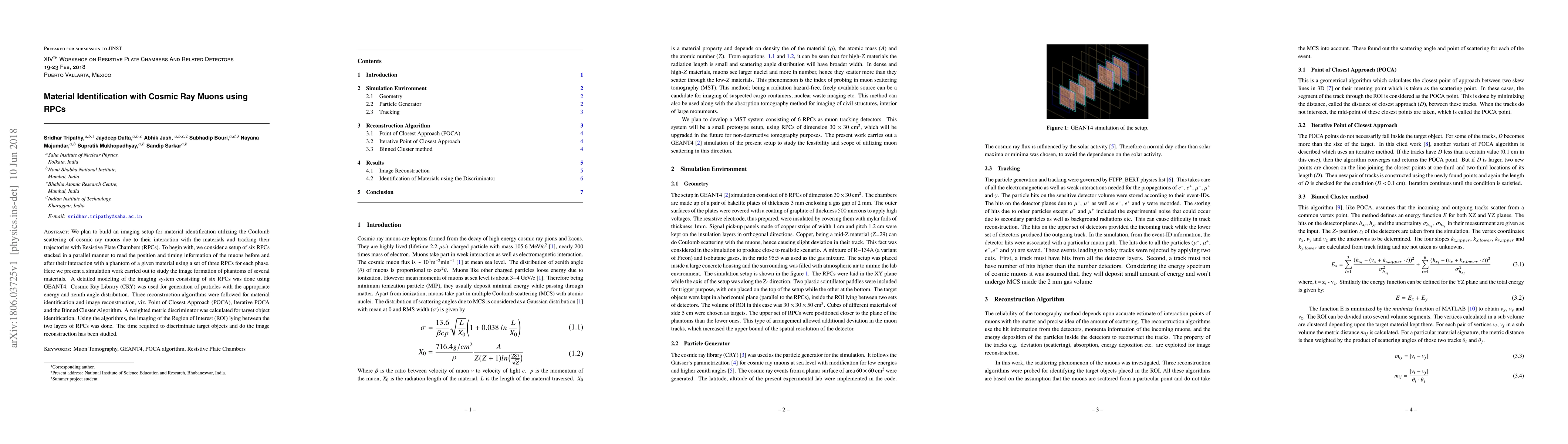 This paper presents a simulation study for material identification using cosmic ray muons and RPCs, focusing on Coulomb scattering and muon trajectory tracking. The setup involves six RPCs, and three reconstruction algorithms were employed for image formation and material discrimination.