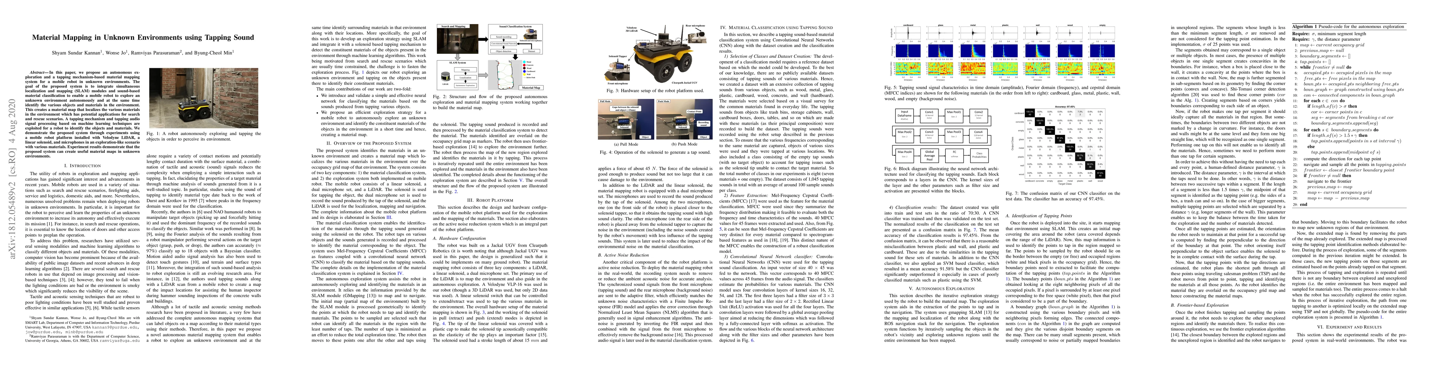 This paper presents an autonomous exploration system for a mobile robot that uses tapping sound and machine learning to map materials in unknown environments. The system integrates SLAM and sound-based classification to identify objects and materials, demonstrating potential for search and rescue applications.