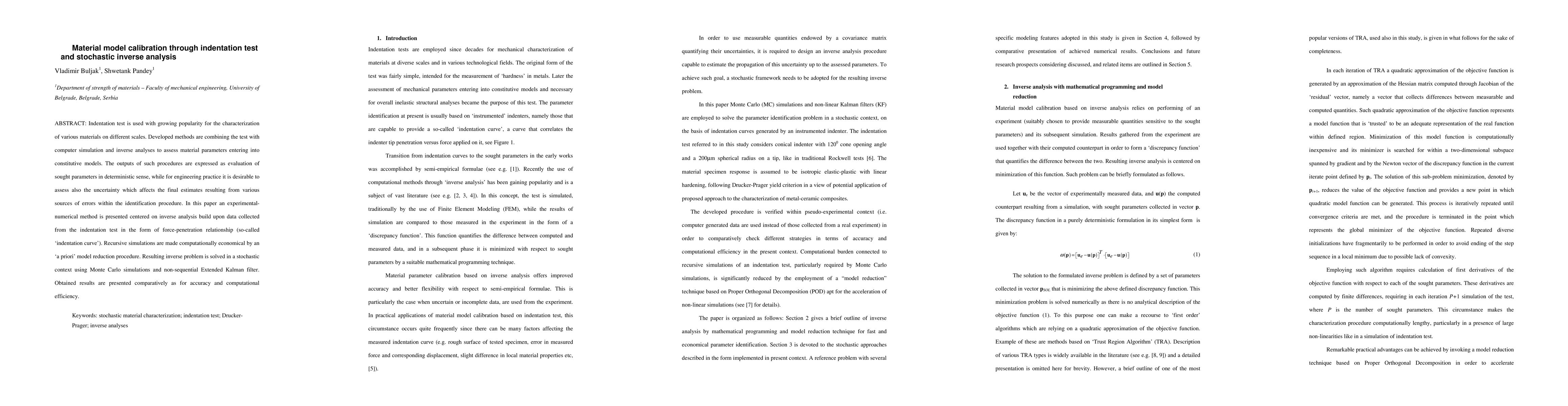 This paper presents an experimental-numerical method for calibrating material models using indentation test data and stochastic inverse analysis, focusing on assessing uncertainties in parameter estimates. The method employs recursive simulations and a stochastic approach with Monte Carlo simulations and the Extended Kalman filter for efficient computation.
