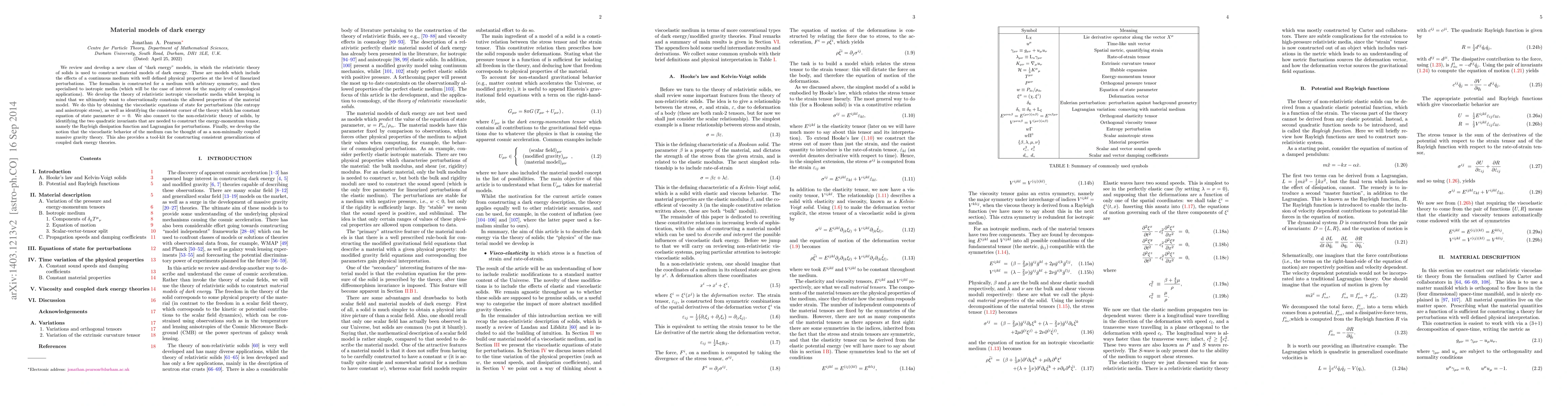 We review and develop a new class of "dark energy" models, in which the relativistic theory of solids is used to construct material models of dark energy. These are models which include the effects of a continuous medium with well defined physical properties at the level of linearized perturbations. The formalism is constructed for a medium with arbitrary symmetry, and then specialised to isotropic media (which will be the case of interest for the majority of cosmological applications). We develop the theory of relativistic isotropic viscoelastic media whilst keeping in mind that we ultimately want to observationally constrain the allowed properties of the material model. We do this by obtaining the viscoelastic equations of state for perturbations (the entropy and anisotropic stress), as well as identifying the consistent corner of the theory which has constant equation of state parameter $\dot{w}=0$. We also connect to the non-relativistic theory of solids, by identifying the two quadratic invariants that are needed to construct the energy-momentum tensor, namely the Rayleigh dissipation function and Lagrangian for perturbations. Finally, we develop the notion that the viscoelastic behavior of the medium can be thought of as a non-minimally coupled massive gravity theory. This also provides a tool-kit for constructing consistent generalizations of coupled dark energy theories.