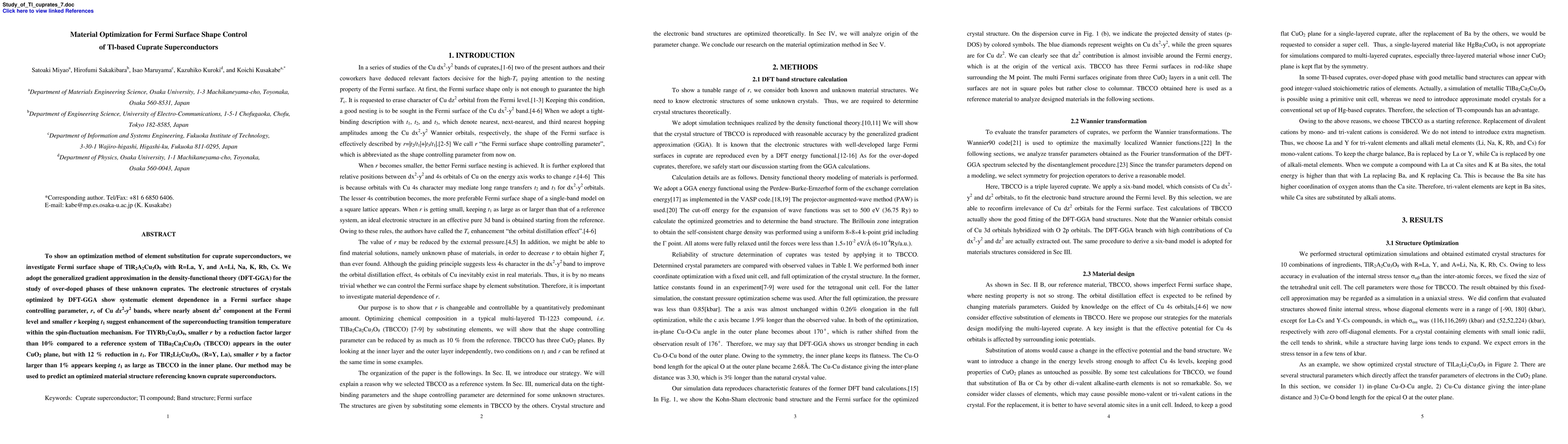This research optimizes Tl-based cuprate superconductor materials by substituting elements, using DFT-GGA to control Fermi surface shape. Findings suggest enhanced superconducting temperature via smaller 'r' values maintaining t1, with TlYRb2Cu3O9 and TlR2Li2Cu3O9 showing promising results for material design.