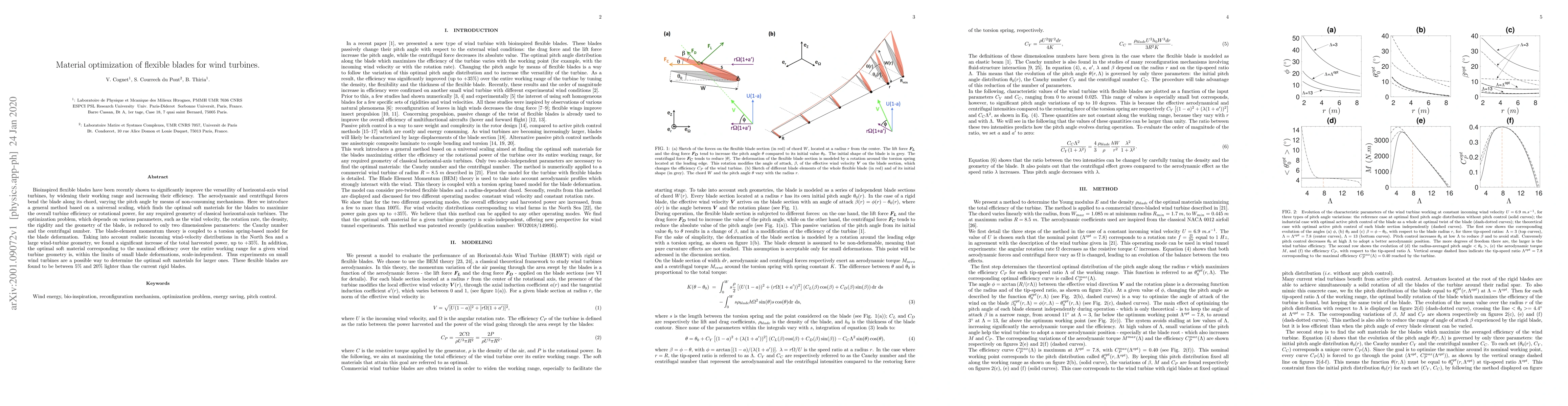 This paper presents a method for optimizing the material of flexible wind turbine blades inspired by biomimicry, showing a significant increase in efficiency and power output by up to +35%. The optimization reduces to two dimensionless parameters and identifies optimal soft materials that are scale-independent, making small-scale experiments applicable to larger turbines.