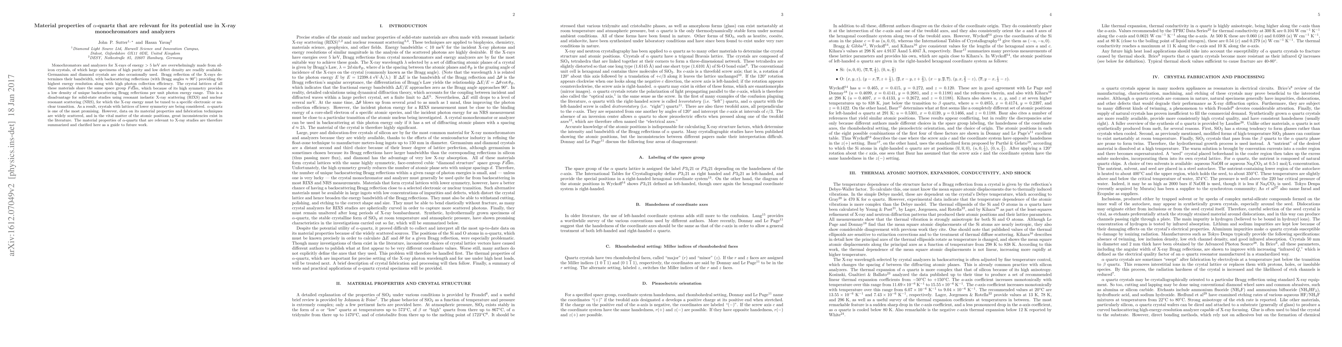 This paper summarizes the material properties of $\alpha$-quartz relevant for its potential use in X-ray monochromators and analyzers, highlighting its suitability due to lower symmetry compared to silicon, germanium, and diamond, which could improve energy resolution in resonant inelastic X-ray scattering and nuclear resonant scattering. It addresses inconsistencies in the literature regarding atomic positions and fabrication techniques.