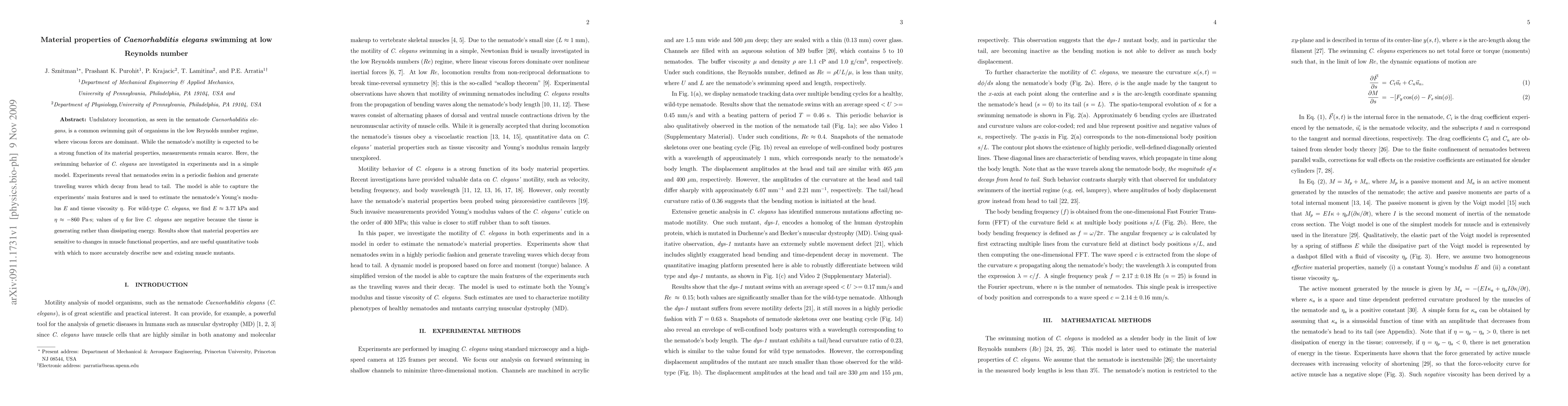 This study investigates the material properties of \emph{Caenorhabditis elegans} during low Reynolds number swimming, revealing periodic undulatory locomotion and estimating the nematode's Young's modulus and tissue viscosity, which are sensitive to muscle functional changes.