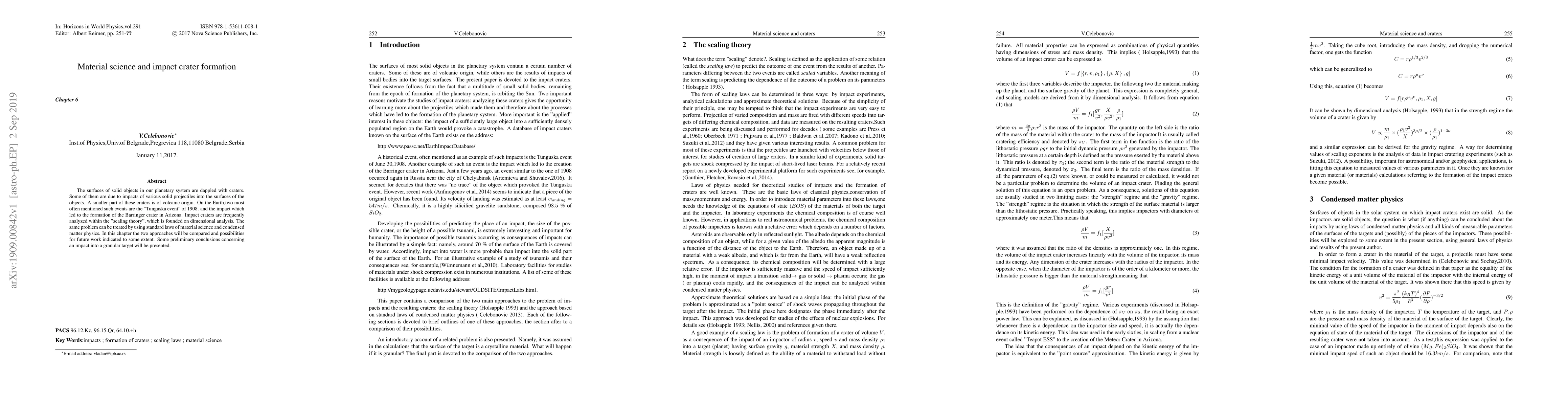 The surfaces of solid objects in our planetary system are dappled with craters. Some of them are due to impacts of various solid projectiles into the surfaces of the objects. A smaller part of these craters is of volcanic origin. %Some of these are of volcanic origin, but others are consequences of impacts of various projectiles into the objects concerned On the Earth,two most often mentioned such events are the "Tunguska event" of 1908. and the impact which led to the formation of the Barringer crater in Arizona. Impact craters are frequently analyzed within the "scaling theory", which is founded on dimensional analysis. The same problem can be treated by using standard laws of material science and condensed matter physics. In this chapter the two approaches will be compared and possibilities for future work indicated to some extent. Some preliminary conclusions concerning an impact into a granular target will be presented.