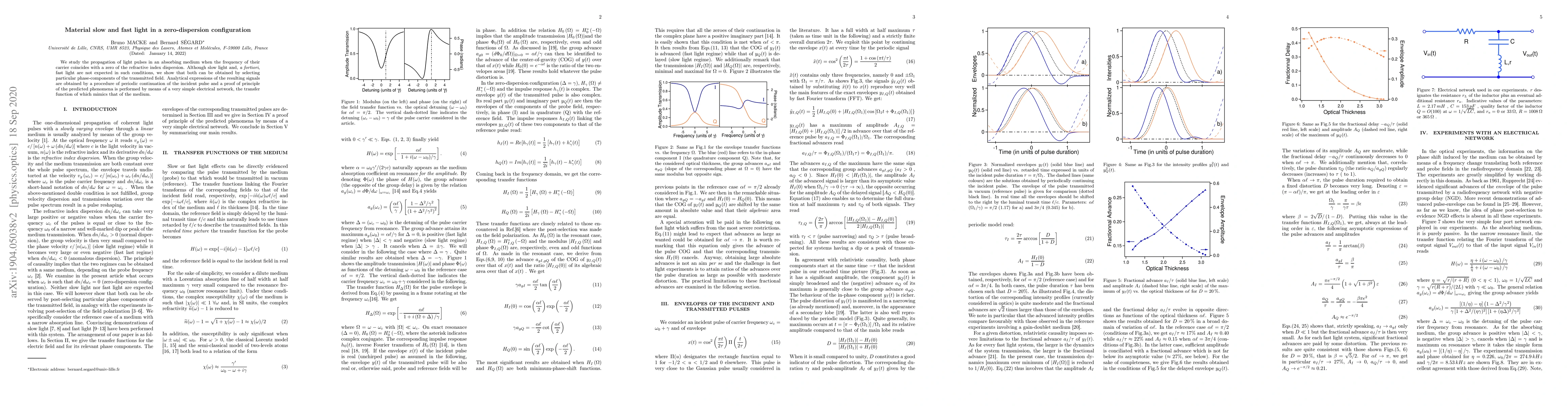 We study the propagation of light pulses in an absorbing medium when the frequency of their carrier coincides with a zero of the refractive index dispersion. Although slow light and, a fortiori, fast light are not expected in such conditions, we show that both can be obtained by selecting particular phase-components of the transmitted field. Analytical expressions of the resulting signals are obtained by a procedure of periodic continuation of the incident pulse and a proof of principle of the predicted phenomena is performed by means of a very simple electrical network, the transfer function of which mimics that of the medium.