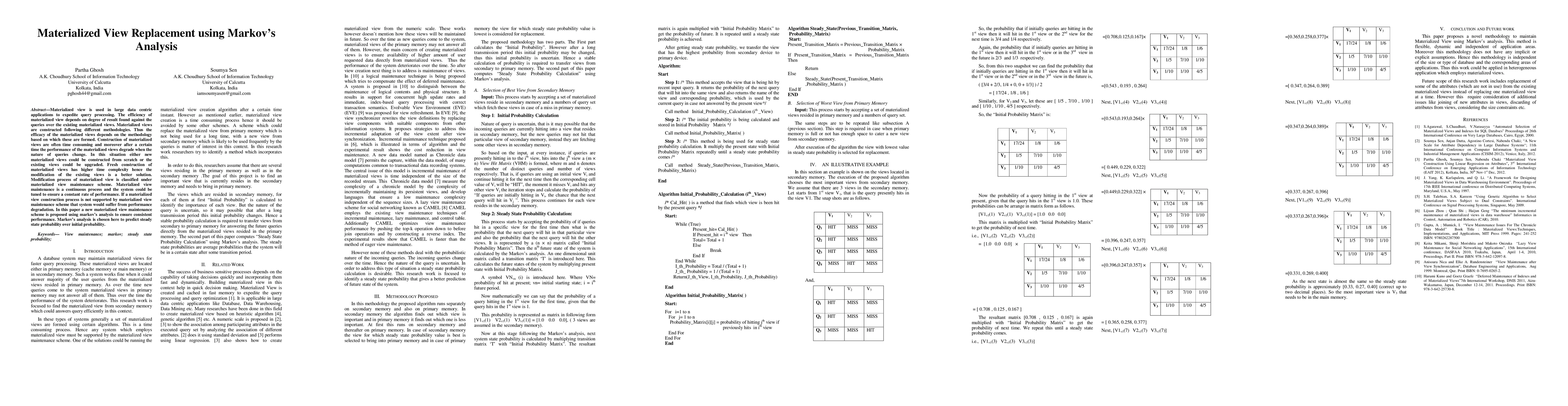 This paper proposes a new materialized view maintenance scheme using Markov analysis to predict the steady state probability and ensure consistent performance, addressing the need for efficient query processing in large data-centric applications. The method aims to upgrade existing materialized views instead of constructing new ones, thereby reducing time complexity and maintaining performance as the nature of queries change.