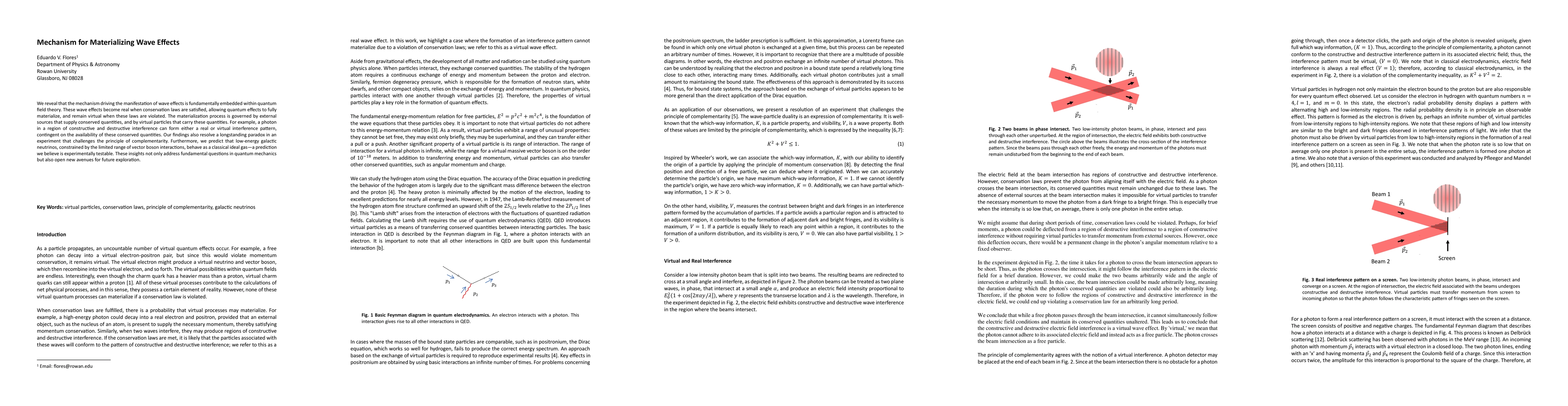 Quantum effects that materialize always fulfill the conservation laws and principles of physics. Physical interactions require the presence of sources and vehicles of conserved quantities. Generally, on-shell particles are sources, and off-shell particles are vehicles of conserved quantities. We have found that when either the source or vehicle is missing, quantum effects cannot materialize. Our findings resolve the alleged violation of complementarity in the Afshar experiment. Additionally, our findings indicate that galactic neutrinos should be treated as a classical ideal gas. To this end, we present a simplified model of a classical ideal gas of neutrinos that accounts for effects attributed to dark matter to a reasonable degree of approximation.