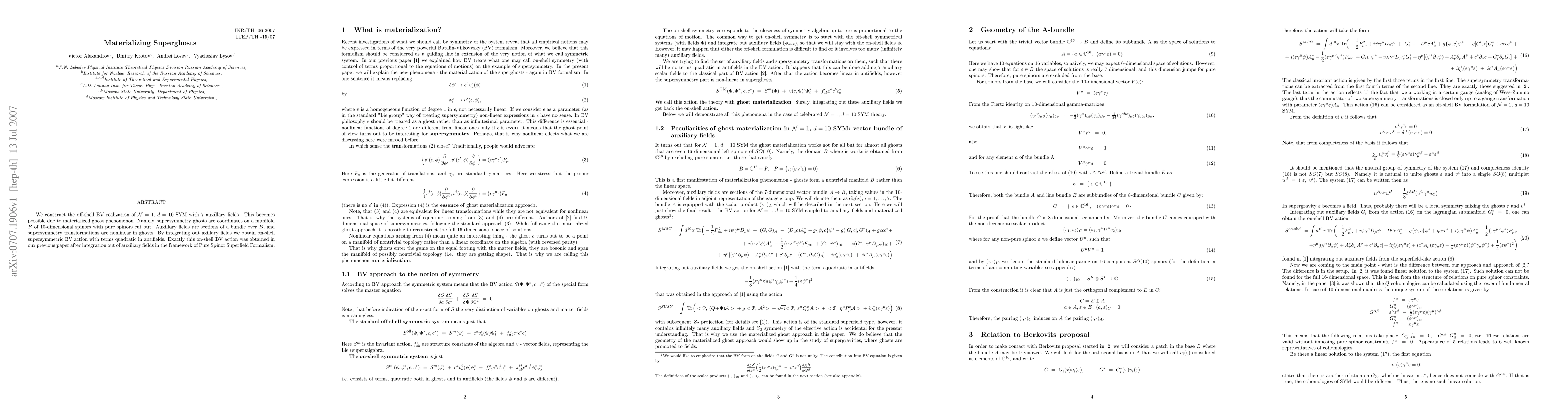 We construct the off-shell BV realization of N=1, d=10 SYM with 7 auxillary fields. This becomes possible due to materialized ghost phenomenon. Namely, supersymmetry ghosts are coordinates on a manifold B of 10-dimensional spinors with pure spinors cut out. Auxillary fields are sections of a bundle over B, and supersymmetry transformations are nonlinear in ghosts. By integrating out axillary fields we obtain on-shell supersymmetric BV action with terms quadratic in antifields. Exactly this on-shell BV action was obtained in our previous paper after integration out of auxiliary fields in the framework of Pure Spinor Superfield Formalism.