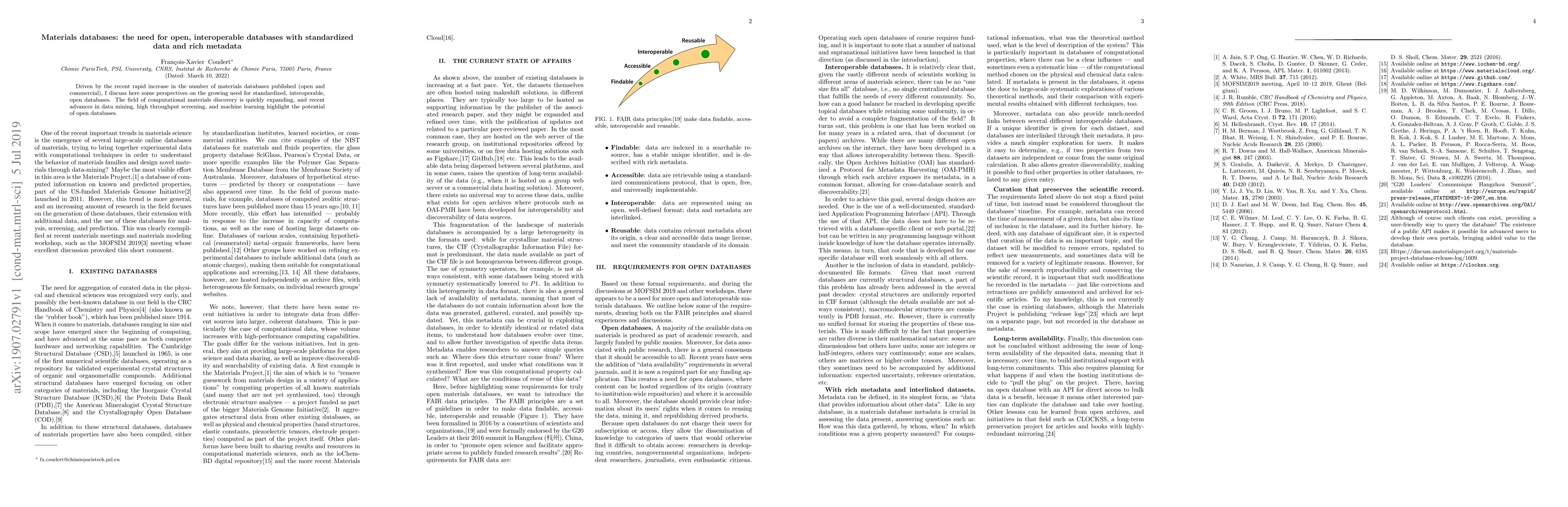 Summary: The paper emphasizes the necessity for standardized, open, and interoperable materials databases to support the rapid growth in computational materials discovery, driven by advancements in data mining and machine learning. Rich metadata is crucial for enhancing the utility of these databases.
