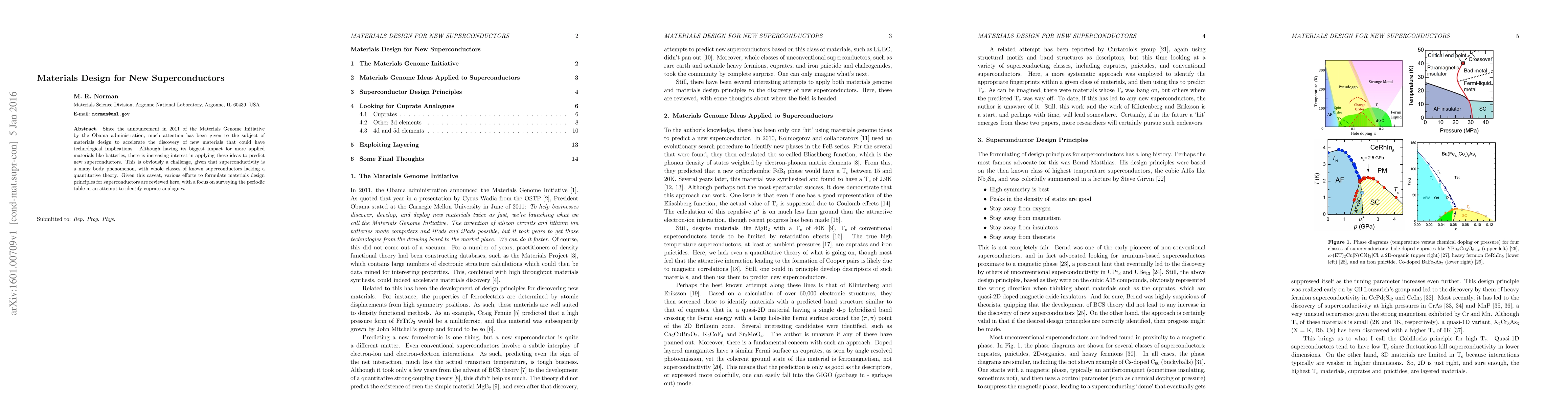 Since the announcement in 2011 of the Materials Genome Initiative by the Obama administration, much attention has been given to the subject of materials design to accelerate the discovery of new materials that could have technological implications. Although having its biggest impact for more applied materials like batteries, there is increasing interest in applying these ideas to predict new superconductors. This is obviously a challenge, given that superconductivity is a many body phenomenon, with whole classes of known superconductors lacking a quantitative theory. Given this caveat, various efforts to formulate materials design principles for superconductors are reviewed here, with a focus on surveying the periodic table in an attempt to identify cuprate analogues.