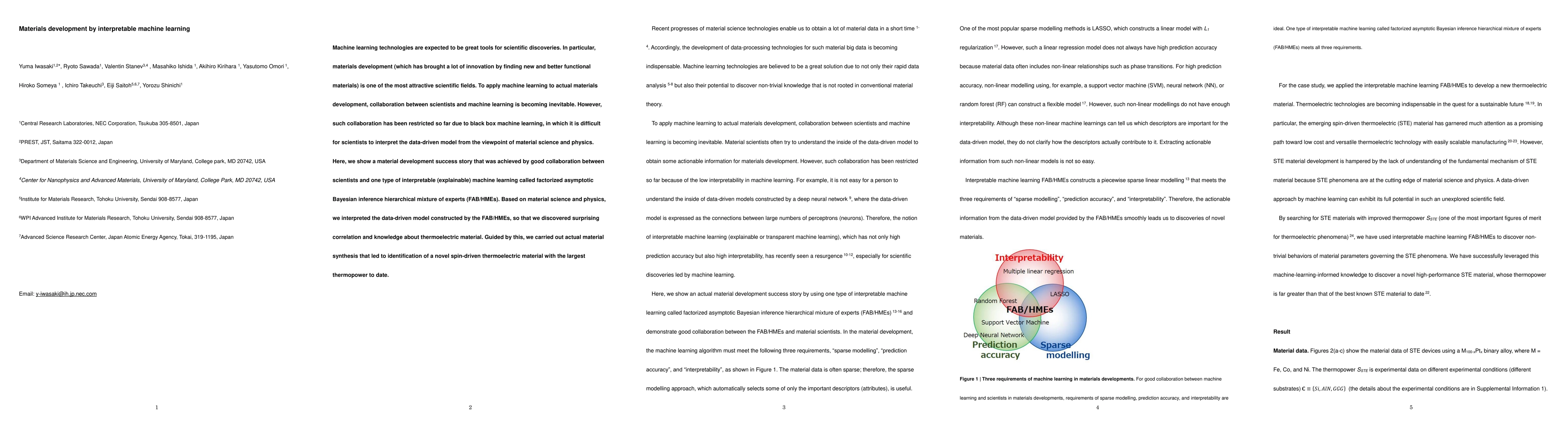 This paper demonstrates how interpretable machine learning, specifically FAB/HMEs, facilitated successful collaboration between scientists and machine learning to develop new thermoelectric materials, uncovering unexpected correlations and ultimately synthesizing a novel material with the highest thermopower identified to date.