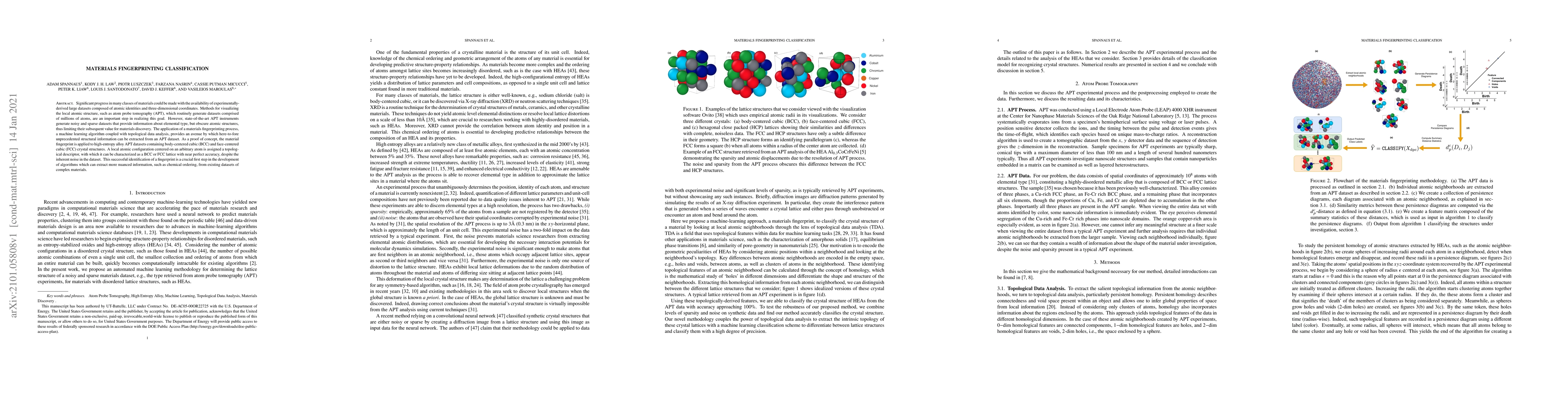 Significant progress in many classes of materials could be made with the availability of experimentally-derived large datasets composed of atomic identities and three-dimensional coordinates. Methods for visualizing the local atomic structure, such as atom probe tomography (APT), which routinely generate datasets comprised of millions of atoms, are an important step in realizing this goal. However, state-of-the-art APT instruments generate noisy and sparse datasets that provide information about elemental type, but obscure atomic structures, thus limiting their subsequent value for materials discovery. The application of a materials fingerprinting process, a machine learning algorithm coupled with topological data analysis, provides an avenue by which here-to-fore unprecedented structural information can be extracted from an APT dataset. As a proof of concept, the material fingerprint is applied to high-entropy alloy APT datasets containing body-centered cubic (BCC) and face-centered cubic (FCC) crystal structures. A local atomic configuration centered on an arbitrary atom is assigned a topological descriptor, with which it can be characterized as a BCC or FCC lattice with near perfect accuracy, despite the inherent noise in the dataset. This successful identification of a fingerprint is a crucial first step in the development of algorithms which can extract more nuanced information, such as chemical ordering, from existing datasets of complex materials.