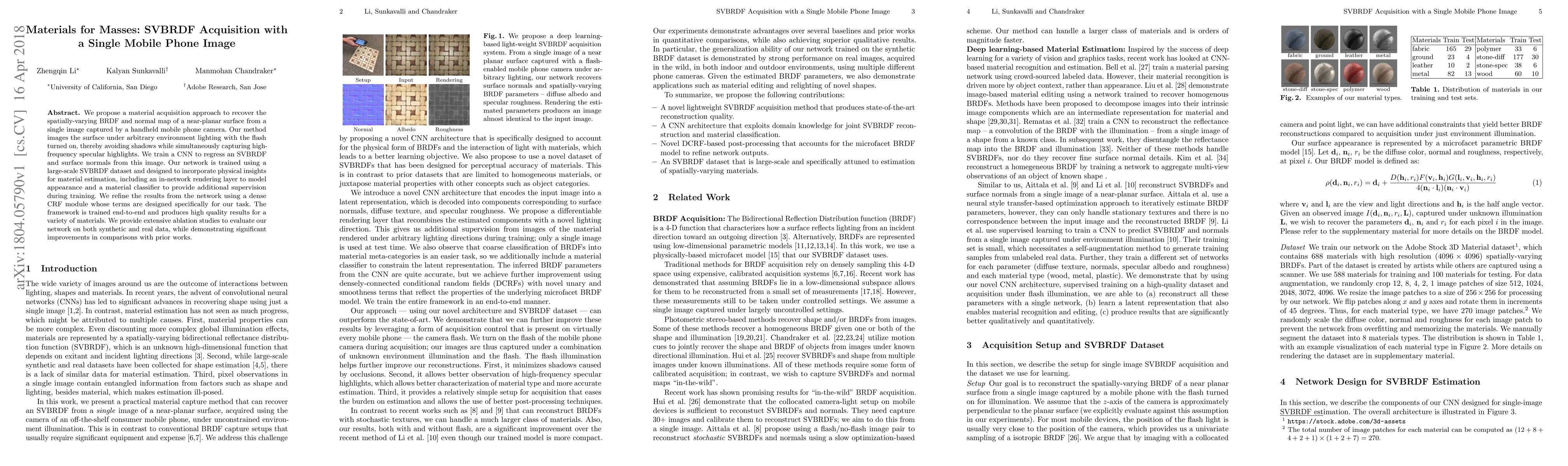 Researchers developed a method to acquire material properties from a single image taken with a mobile phone camera, achieving high-quality results for various materials. Their approach uses a deep learning network trained on large-scale data and incorporates physical insights to estimate appearance and surface normals.