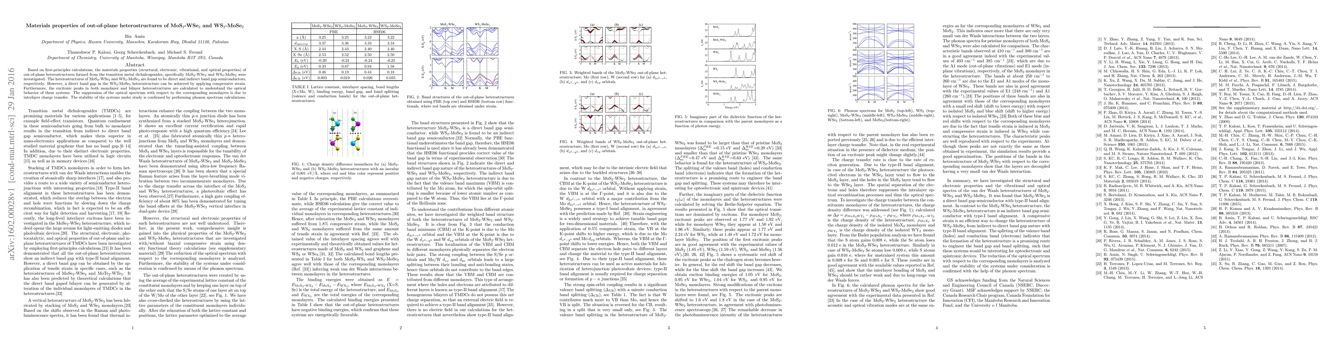 Based on first-principles calculations, the materials properties (structural, electronic, vibrational, and optical properties) of out-of-plane heterostructures formed from the transiti on metal dichalcogenides, specifically MoS$_2$-WSe$_2$ and WS$_2$-MoSe$_2$ were investigated. The heterostructures of MoS$_2$-WSe$_2$ and WS$_2$-MoSe$_2$ are found to be direct and ind irect band gap semiconductors, respectively. However, a direct band gap in the WS$_2$-MoSe$_2$ heterostructure can be achieved by applying compressive strain. Furthermore, the excitoni c peaks in both monolayer and bilayer heterostructures are calculated to understand the optical behavior of these systems. The suppression of the optical spectrum with respect to the c orresponding monolayers is due to interlayer charge transfer. The stability of the systems under study is confirmed by performing phonon spectrum calculations.
