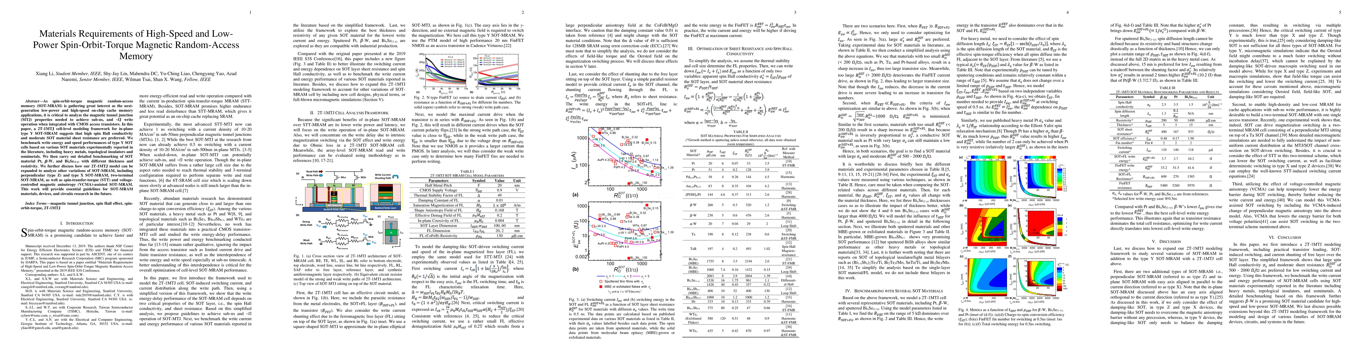 This paper explores material requirements for high-speed, low-power spin-orbit-torque magnetic random-access memory (SOT-MRAM), highlighting the need for high spin Hall conductivity and moderate SOT sheet resistance. It benchmarks various SOT materials for optimal write performance and discusses extending the 2T-1MTJ model to other SOT-MRAM variants, providing critical guidelines for future research.