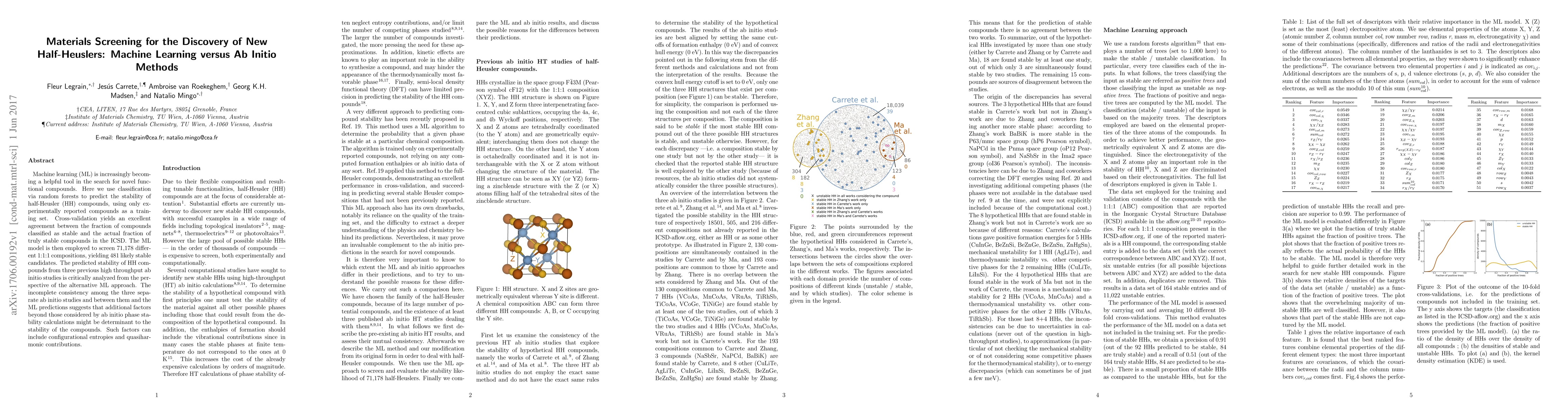 This paper employs machine learning to predict the stability of half-Heusler compounds, identifying 481 likely stable candidates from a large screening. It contrasts these findings with previous ab initio studies, highlighting discrepancies that suggest additional factors like configurational entropies influence stability.