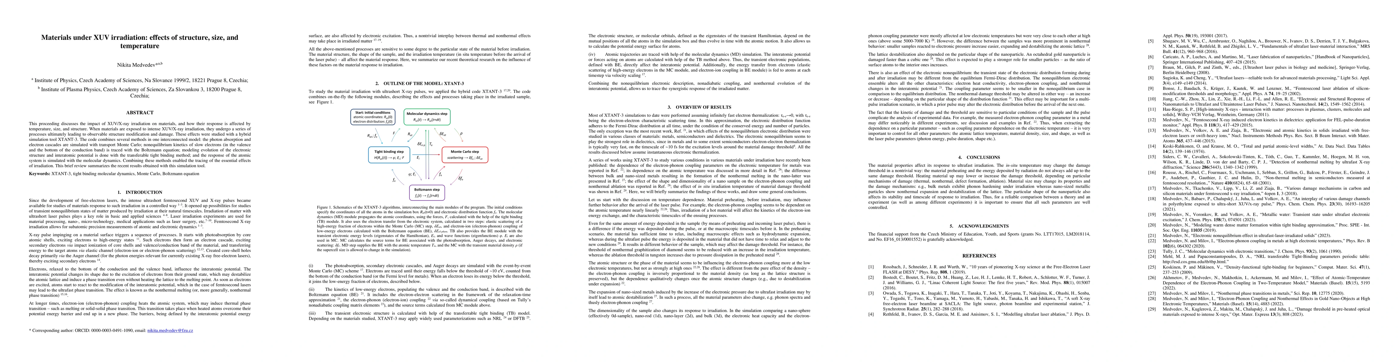 This proceeding discusses the impact of XUV/X-ray irradiation on materials, and how their response is affected by temperature, size, and structure. When materials are exposed to intense XUV/X-ray irradiation, they undergo a series of processes ultimately leading to observable structure modification and damage. These effects were studied with a hybrid simulation tool XTANT-3. The code combines several methods in one interconnected model: the photon absorption and electron cascades are simulated with transport Monte Carlo; nonequilibrium kinetics of slow electrons (in the valence and the bottom of the conduction band) is traced with the Boltzmann equation; modeling evolution of the electronic structure and interatomic potential is done with the transferable tight binding method; and the response of the atomic system is simulated with the molecular dynamics. Combining these methods enabled the tracing of the essential effects of irradiation. This brief review summarizes the recent results obtained with this simulation tool.