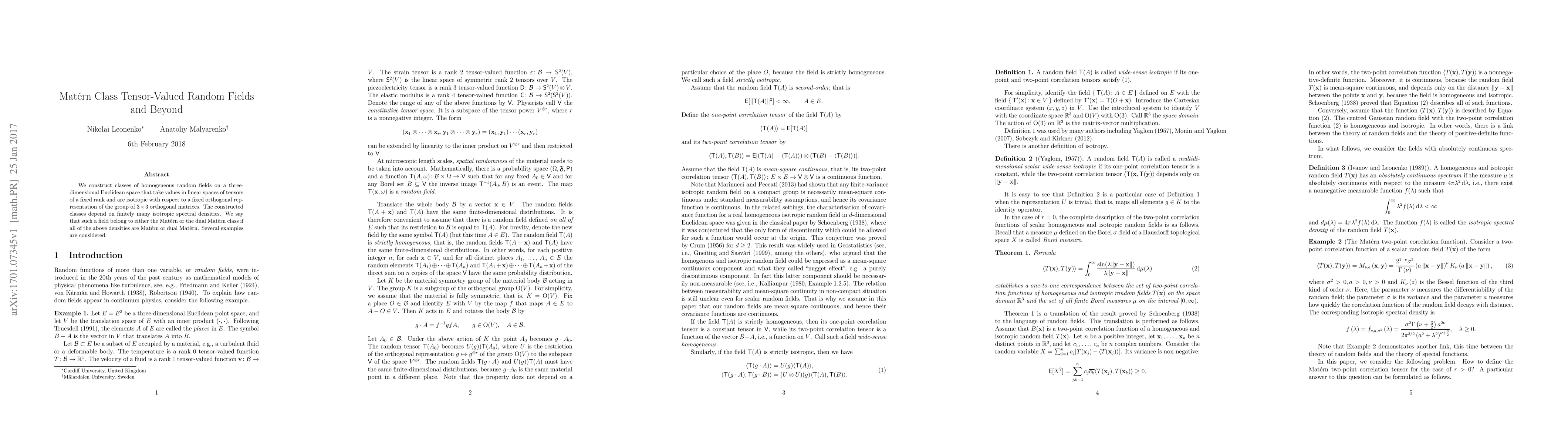 We construct classes of homogeneous random fields on a three-dimensional Euclidean space that take values in linear spaces of tensors of a fixed rank and are isotropic with respect to a fixed orthogonal representation of the group of $3\times 3$ orthogonal matrices. The constructed classes depend on finitely many isotropic spectral densities. We say that such a field belong to either the Mat\'{e}rn or the dual Mat\'{e}rn class if all of the above densities are Mat\'{e}rn or dual Mat\'{e}rn. Several examples are considered.
