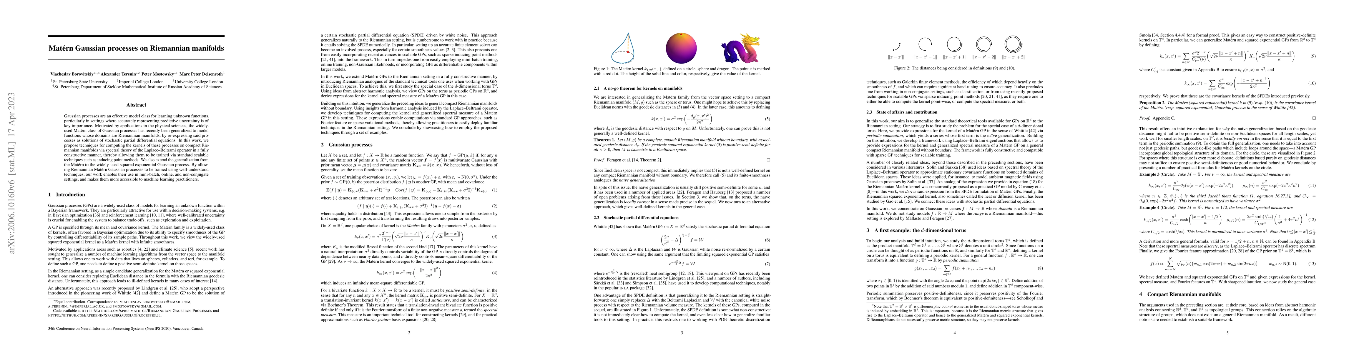 This paper generalizes the Matérn class of Gaussian processes to Riemannian manifolds, enabling their use in physical science applications by expressing them as solutions to stochastic partial differential equations. The authors provide a constructive method for computing kernels via the Laplace-Beltrami operator, enabling scalable training techniques and extending the approach to squared exponential Gaussian processes.
