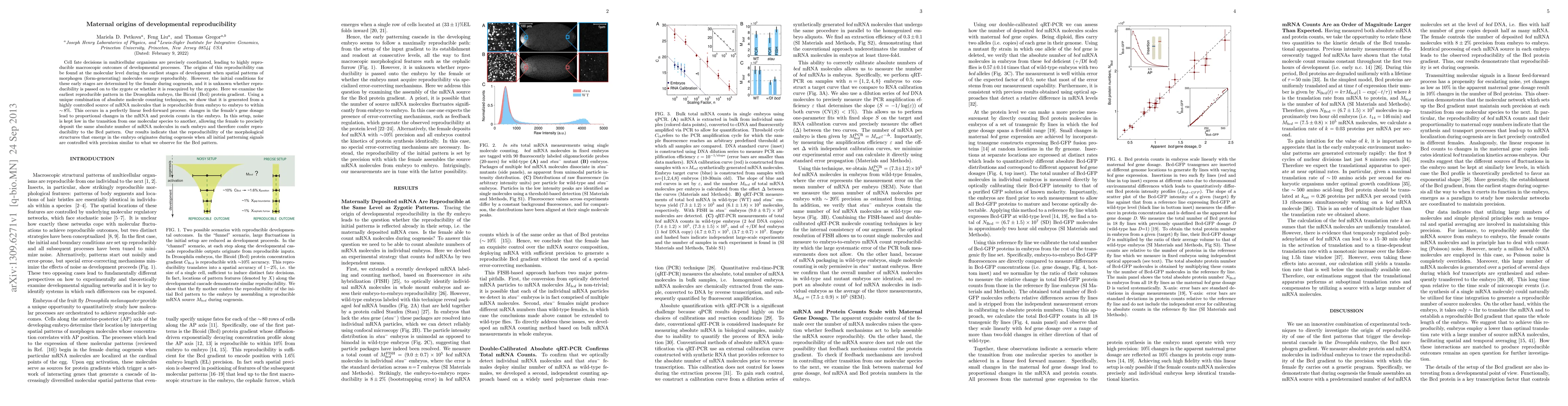 Cell fate decisions in multicellular organisms are precisely coordinated, leading to highly reproducible macroscopic outcomes of developmental processes. The origins of this reproducibility can be found at the molecular level during the earliest stages of development when spatial patterns of morphogen (form-generating) molecules emerge reproducibly. However, the initial conditions for these early stages are determined by the female during oogenesis, and it is unknown whether reproducibility is passed on to the zygote or whether it is reacquired by the zygote. Here we examine the earliest reproducible pattern in the Drosophila embryo, the Bicoid protein gradient. Using a unique combination of absolute molecule counting techniques, we show that it is generated from a highly controlled source of mRNA molecules that is reproducible from embryo to embryo to within ~8%. This occurs in a perfectly linear feed-forward process: changes in the female's gene dosage lead to proportional changes in the mRNA and protein counts in the embryo. In this setup, noise is kept low in the transition from one molecular species to another, allowing the female to precisely deposit the same absolute number of mRNA molecules in each embryo and therefore confer reproducibility to the Bicoid pattern. Our results indicate that the reproducibility of the morphological structures that emerge in the embryo originates during oogenesis when all initial patterning signals are controlled with precision similar to what we observe for the Bicoid pattern.