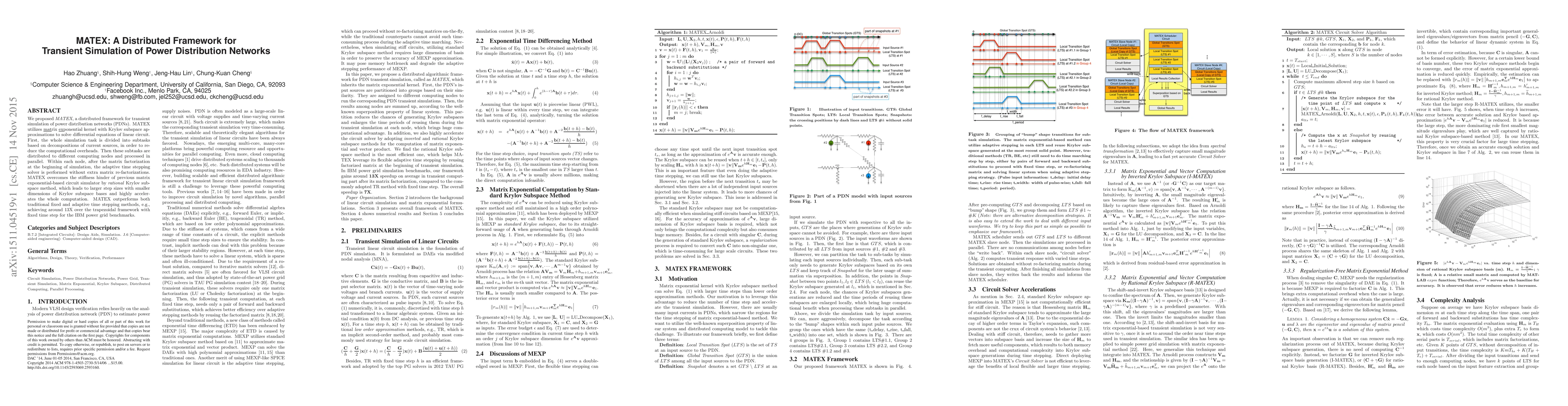 MATEX is a distributed framework for transient simulation of power distribution networks that accelerates computation by using matrix exponential kernel with Krylov subspace approximations, outperforming traditional methods by up to 13 times.